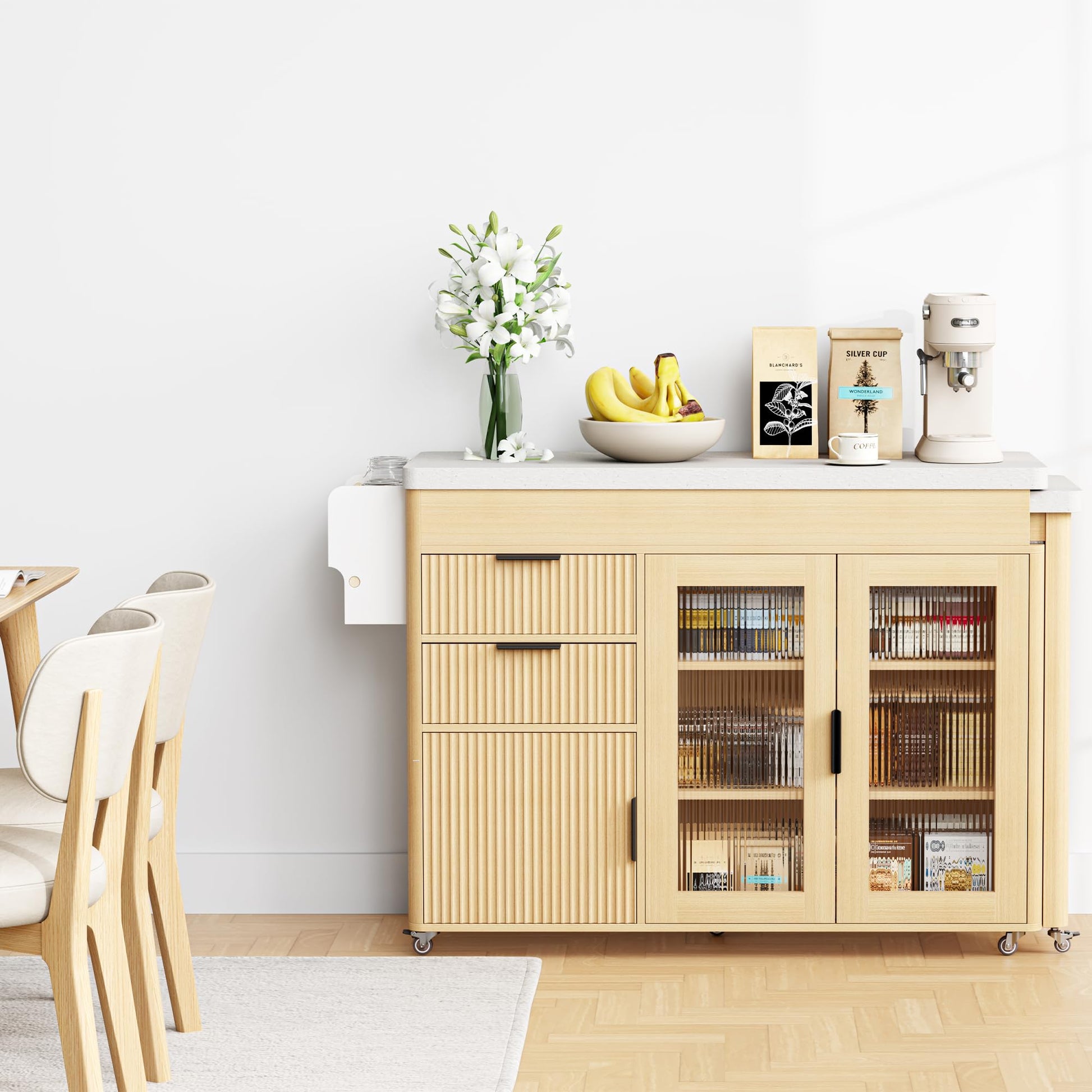 Experience versatile space solutions with this 2-in-1 expandable kitchen island. Easily transition from a compact 47.24"W prep area to a spacious 78.74"W dining table, comfortably accommodating 2-4 additional seats. It seamlessly functions as a worktable, breakfast bar, or serving station, adapting to your daily needs while saving valuable floor space.
