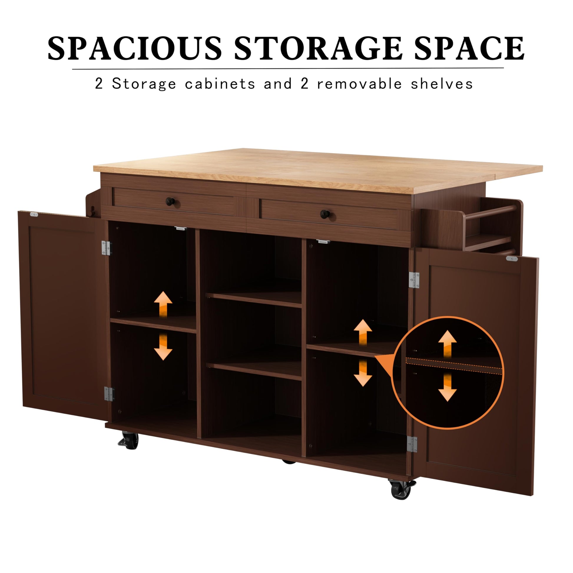 Transform your kitchen with this versatile rolling island cart featuring a solid rubberwood drop-leaf countertop, barn door storage cabinets, and convenient mobility. Perfect for compact kitchens requiring flexible workspace and storage solutions.