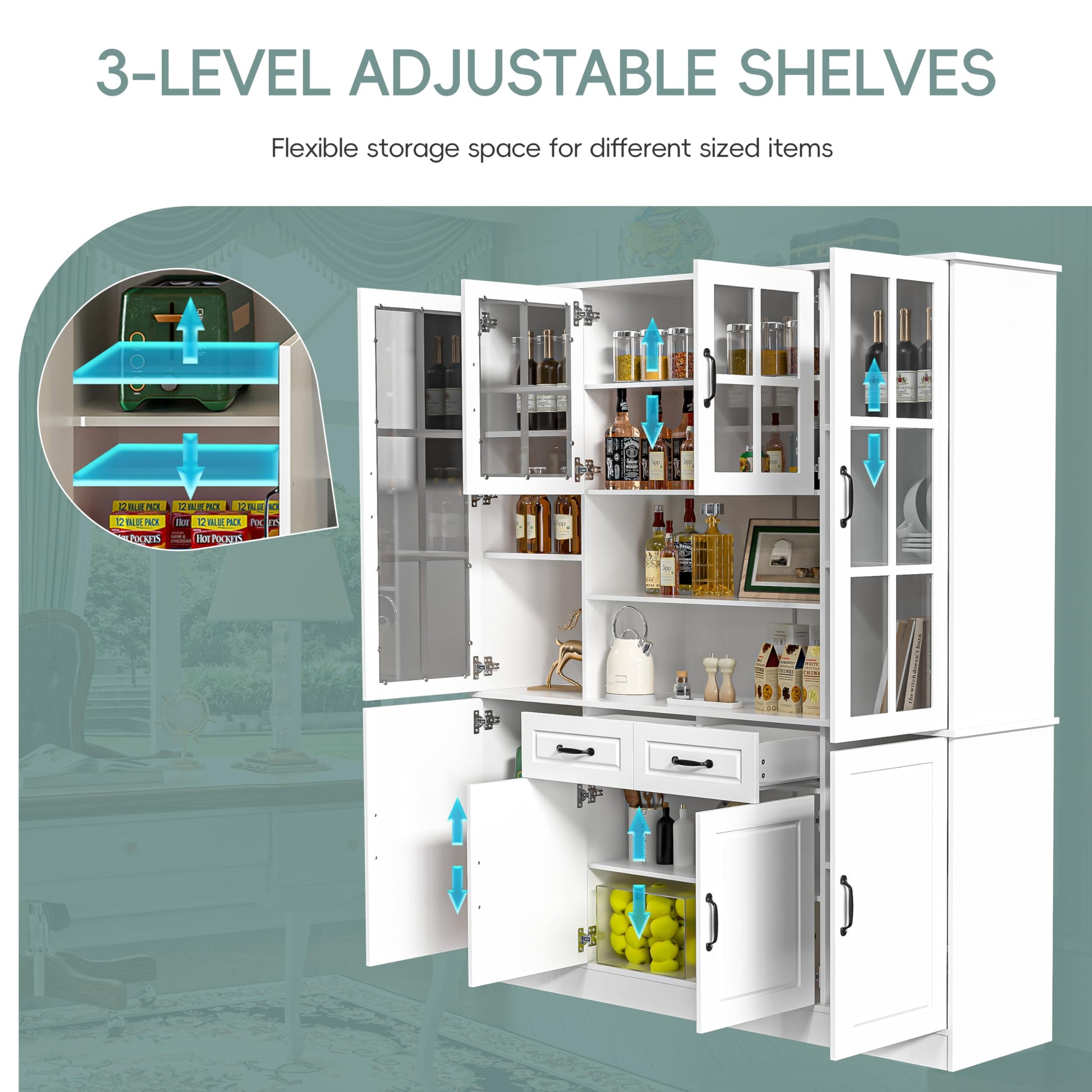This elegant kitchen storage cabinet combines functionality with style, featuring transparent glass doors that showcase your finest dinnerware and collectibles. The spacious design includes 2 convenient drawers and 5 adjustable shelves, allowing you to customize storage to fit your needs.