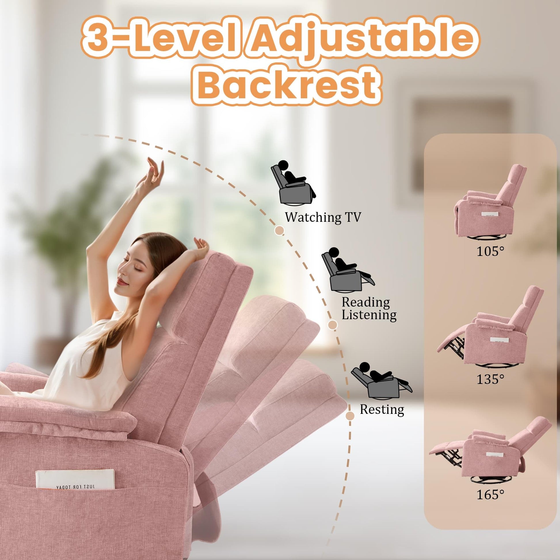 - Fatigue-reliever Swivel Chair: The recliner features a 360° swivel, with smooth rocking, and the backrest can be tilted up to 165°. The chair is equipped with a manual tilt mechanism, and the footrest will automatically extend by simply pulling the lever on the armrest. By gently tilting back, the recliner can be smoothly adjusted to your favorite position, providing personalized comfort. Whether you are reading, watching TV, or taking a nap, you can easily find a satisfying relaxation angle.