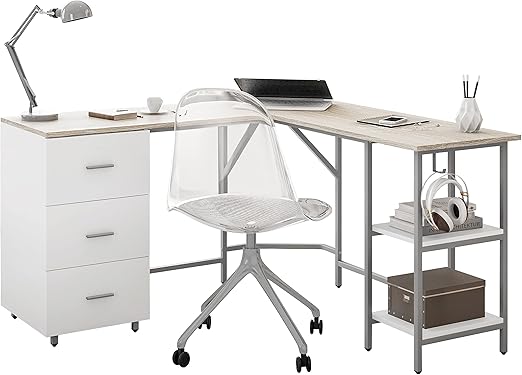 Transform your workspace with this versatile L-shaped corner desk that combines functionality with modern design. Featuring integrated drawers and multiple storage shelves, this desk provides ample space for all your office essentials while maximizing corner space efficiency.
