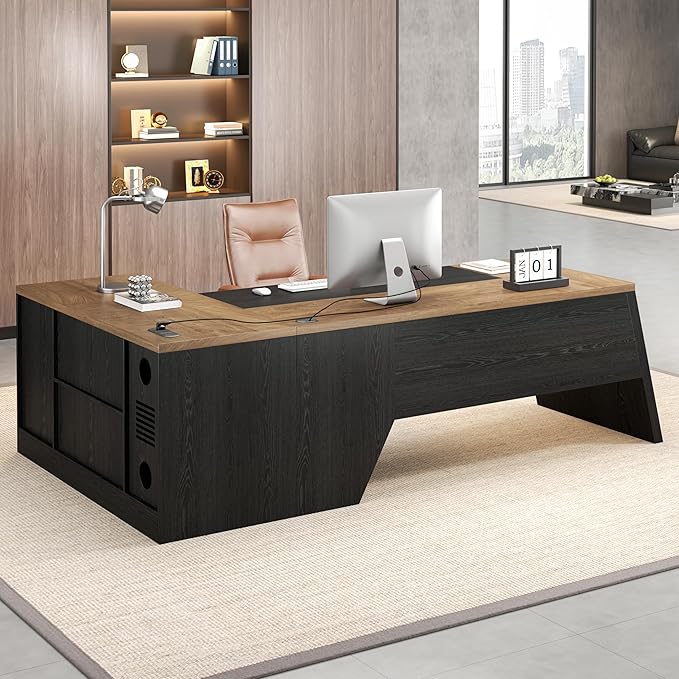 Transform your workspace with this modern L-shaped executive desk designed for maximum productivity and organization. This versatile workstation combines ample surface area with smart storage solutions and integrated power access.