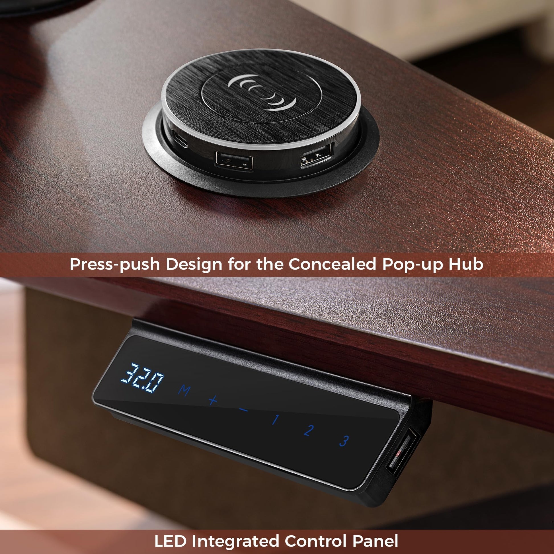 Transform your workspace with this executive L-shaped standing desk that seamlessly blends traditional elegance with modern ergonomic technology. Featuring a warm cherry wood veneer finish with exquisite wavy panel details and natural wood grain texture, this desk brings nostalgic charm to any professional office or home study.