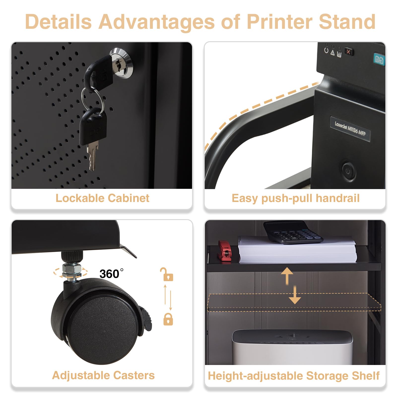 - Multi-functional design with printer, shredder, and PC tower storage