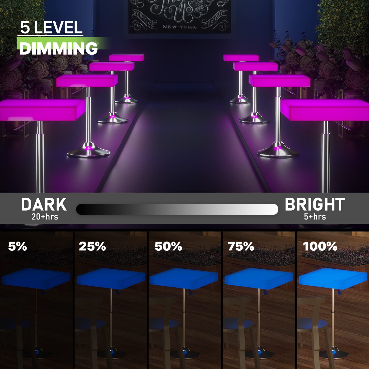 This stunning LED cocktail table features vibrant lighting with 16 different color options, creating a captivating visual display for any occasion. The adjustable height design allows you to customize the table from 29.5 inches to 39 inches, making it perfect for various settings and preferences.