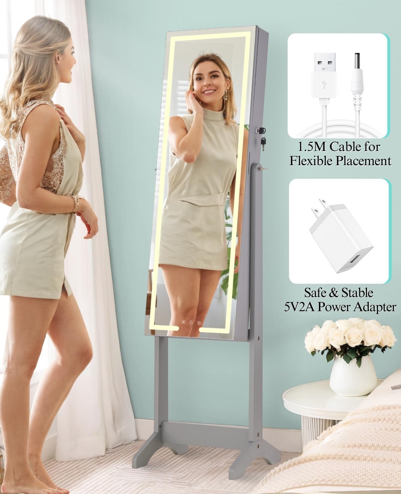 | Included Components | Mirror Jewelry Cabinet, Power Adapter, USB Cable, 2 Keys |