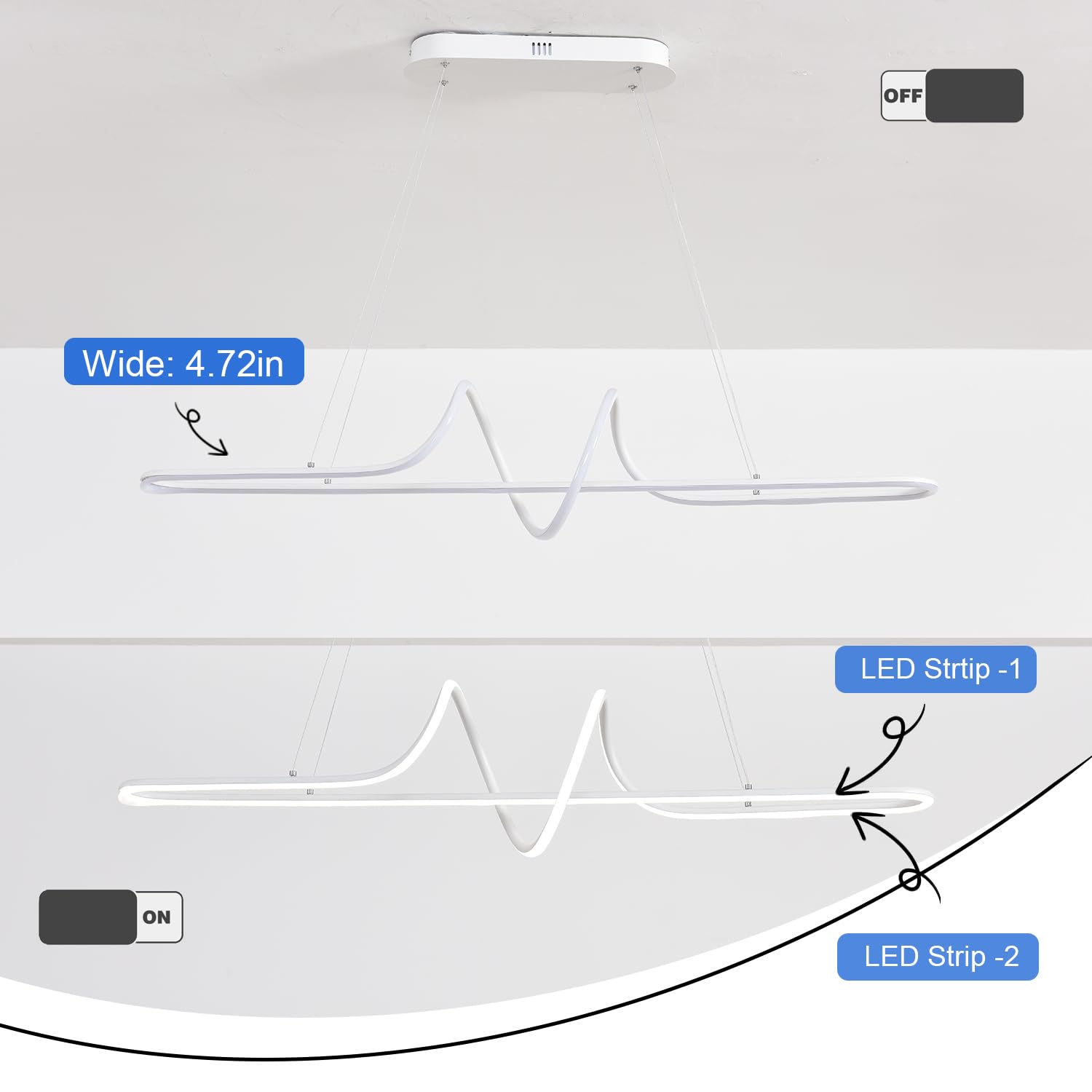 This modern LED pendant light features a distinctive double-arc design that creates a dynamic focal point in any space. The contemporary silhouette blends form and function, inspired by natural curves and elegant minimalist aesthetics.