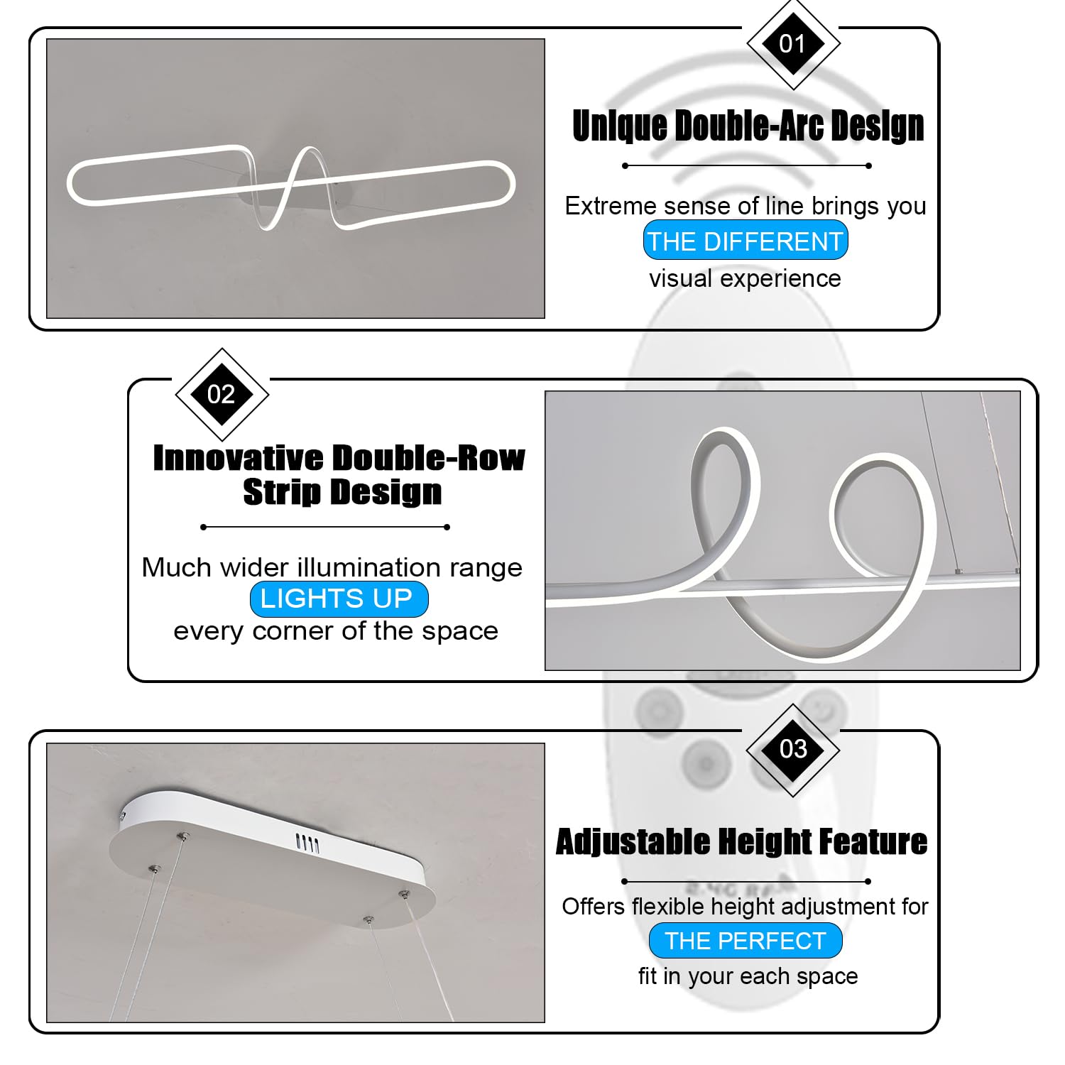- Adjustable hanging wire lengths for customizable installation height