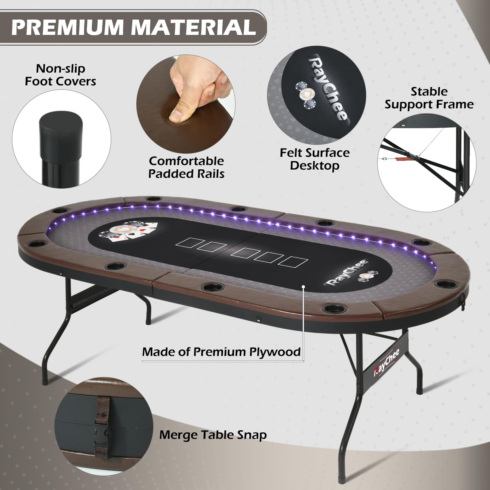 - Built-in LED Lighting: Integrated LED lights create an immersive gaming atmosphere and illuminate your poker night for better visibility during play