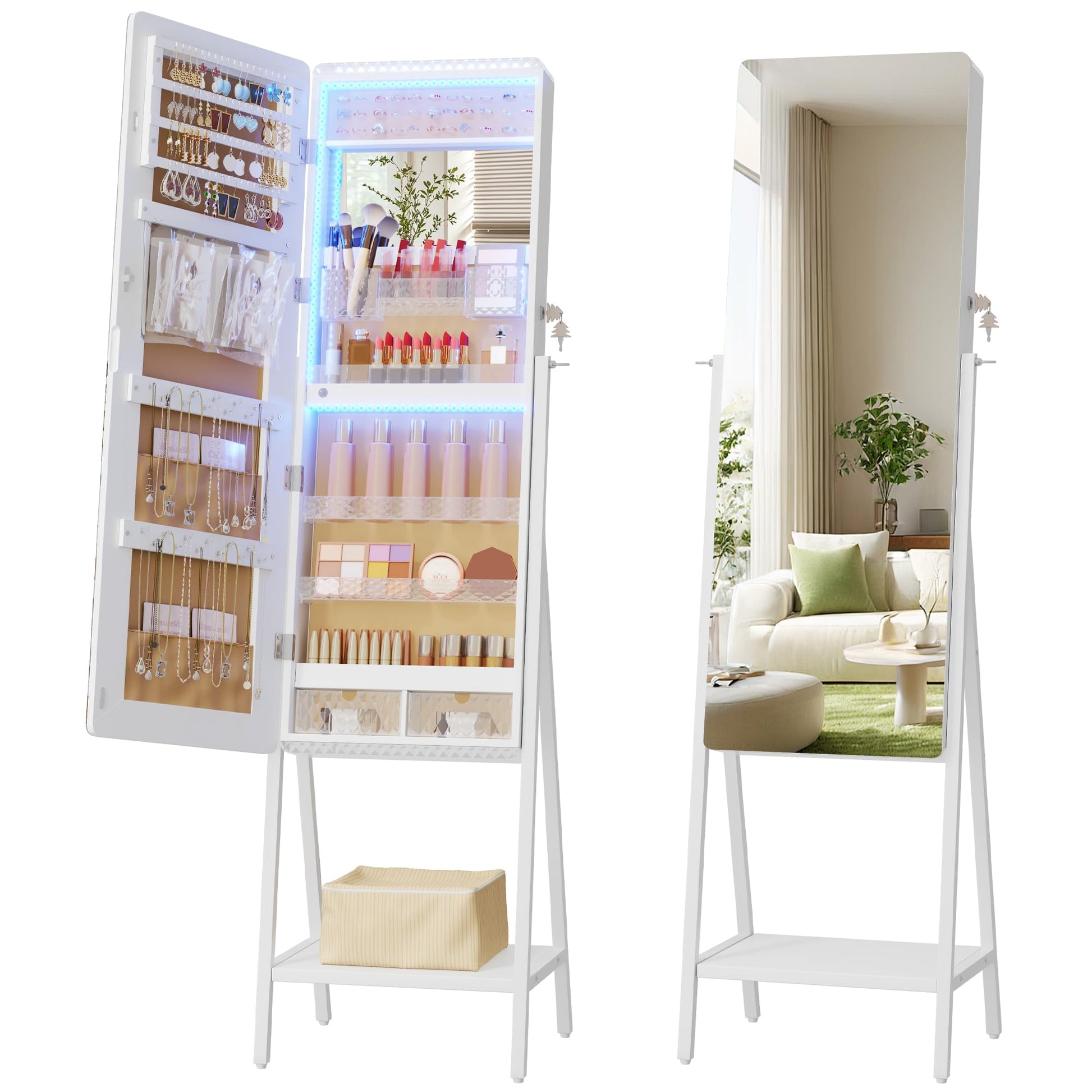 Complete jewelry armoire organizer with full-length mirror, built-in LED makeup mirror, two storage drawers, bottom shelf, and locking mechanism for security.