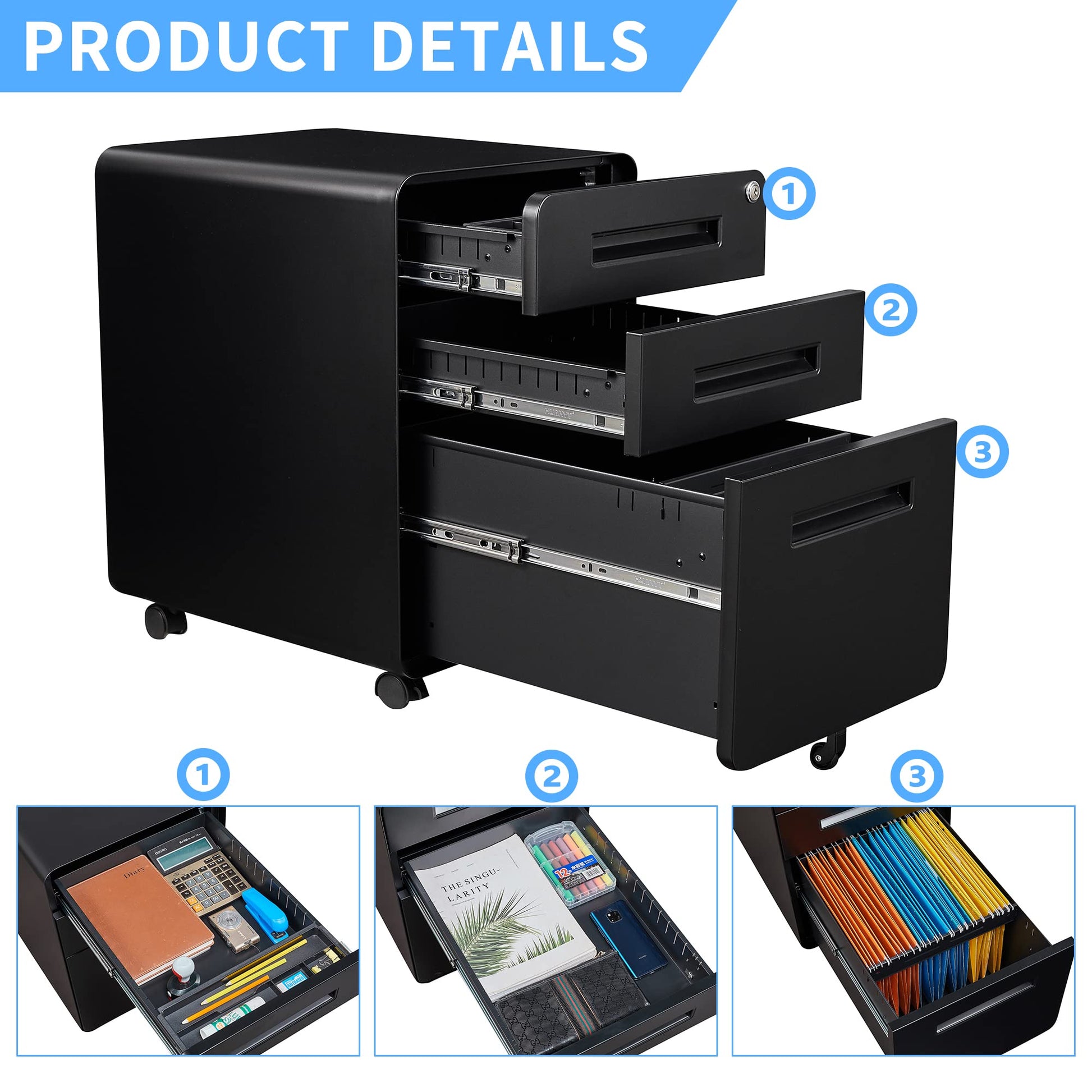 - 【Sturdy and Beautiful】File cabinet with high-strength cold-rolled steel frame, powder-coated immune to corrosion and rust; Modern delicate appearance and fit height make it can be placed under desk perfect for your home or office use.