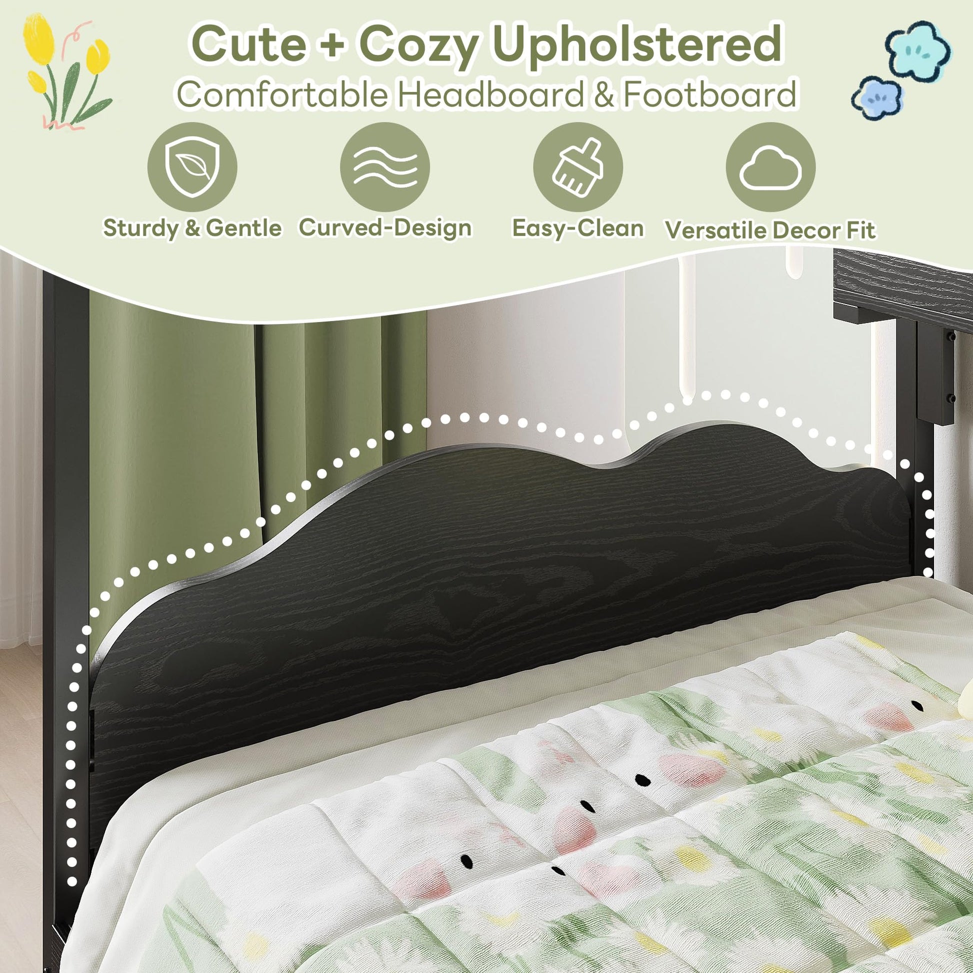 - Black Twin Bed Frame with Headboard & Footboard: The LIKIMIO twin size bed is equipped with premium materials, smooth finish. This cloud-shaped design provides a cozy nook effect and a stylish, versatile look that complements any room decor, all with the easy-clean practicality.