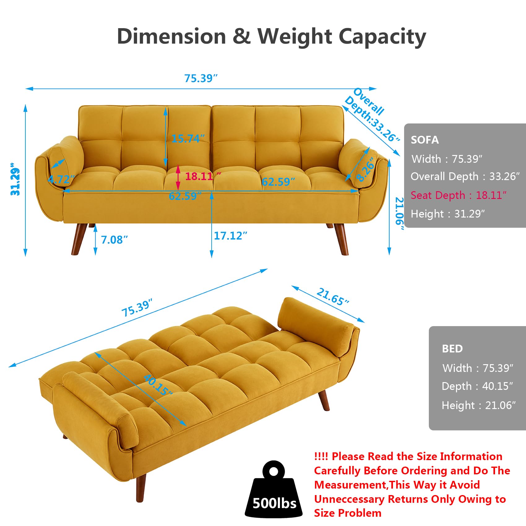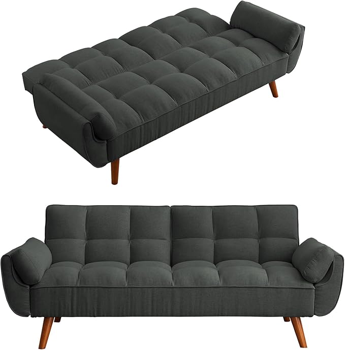 Transform your living space with this versatile convertible futon sofa bed. Featuring a modern mid-century design with tufted plaid cushioning and flared pillow armrests, this sleeper sofa seamlessly transitions from a comfortable 2-seater loveseat to a full twin sleeper bed.