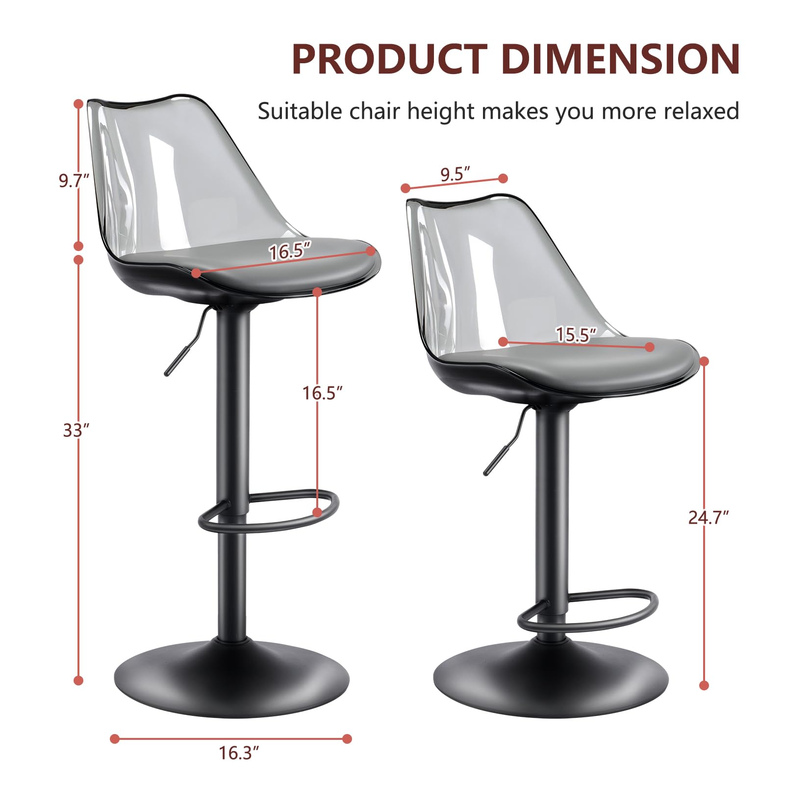 LOVSPATIO Clear Bar Stools Set of 2, Counter Height Adjustable Swivel Acrylic Bar Stools with PU Leather Upholstered, Armless Bar Stools for Kitchen Island - Grey/Black