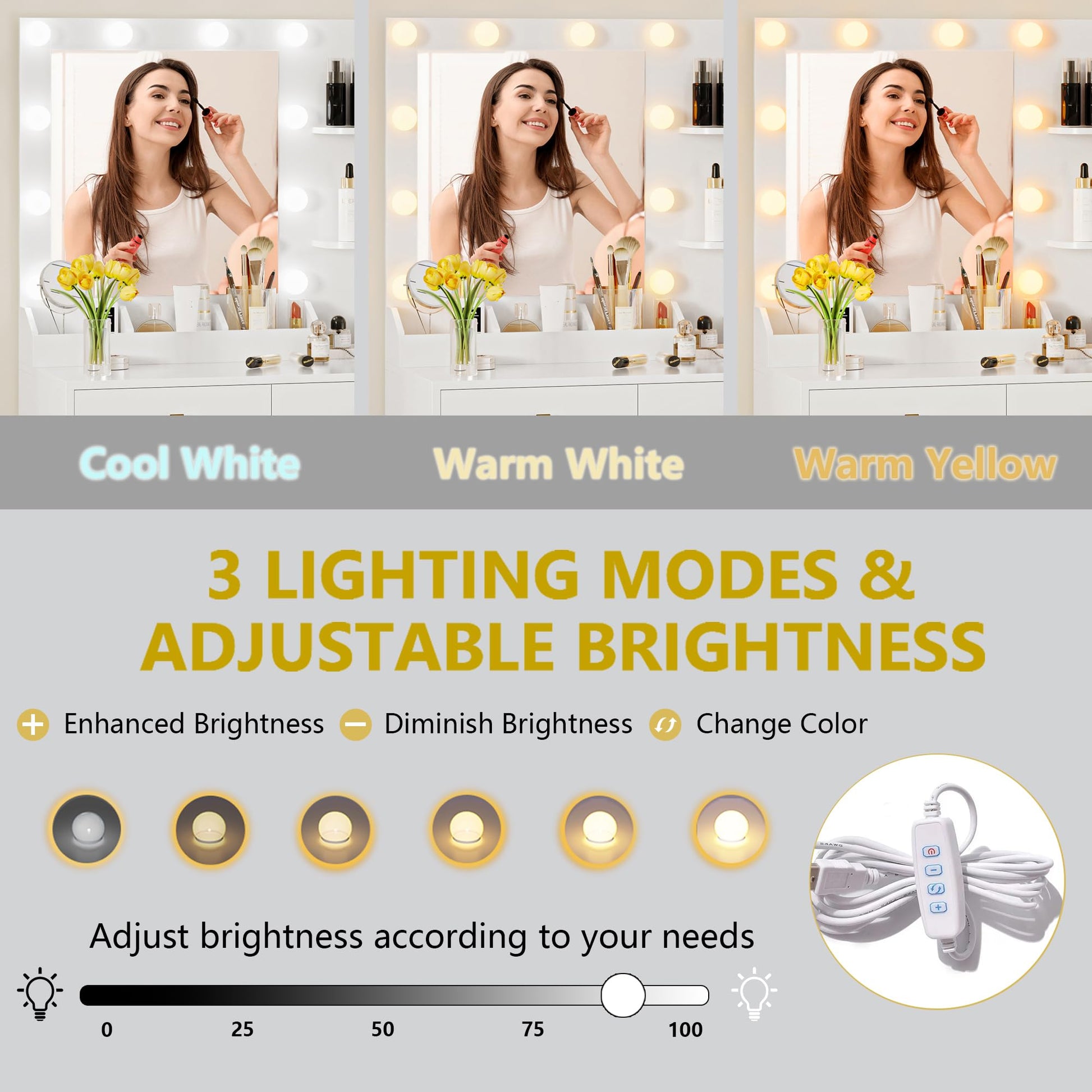 - 3 Lighting Modes with Adjustable Brightness: 10 Hollywood bulbs surrounding the mirror offer warm yellow, natural light, and bright white modes with adjustable brightness to match any makeup need