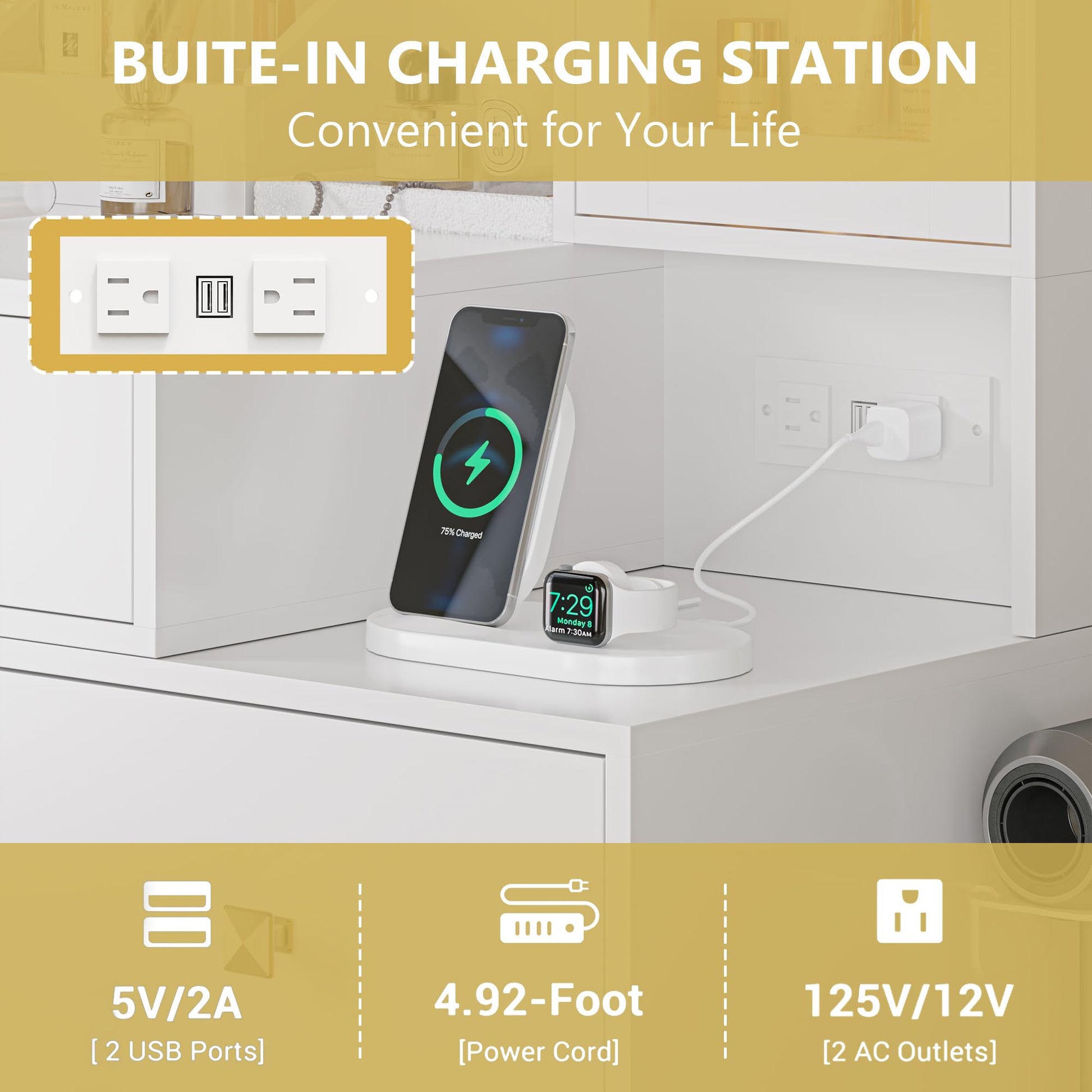 - Convenient Charging Station: Built-in power outlet with 2 AC outlets and 2 USB ports allows simultaneous charging of electronic devices. Includes hair dryer rack to keep styling tools within arm's reach