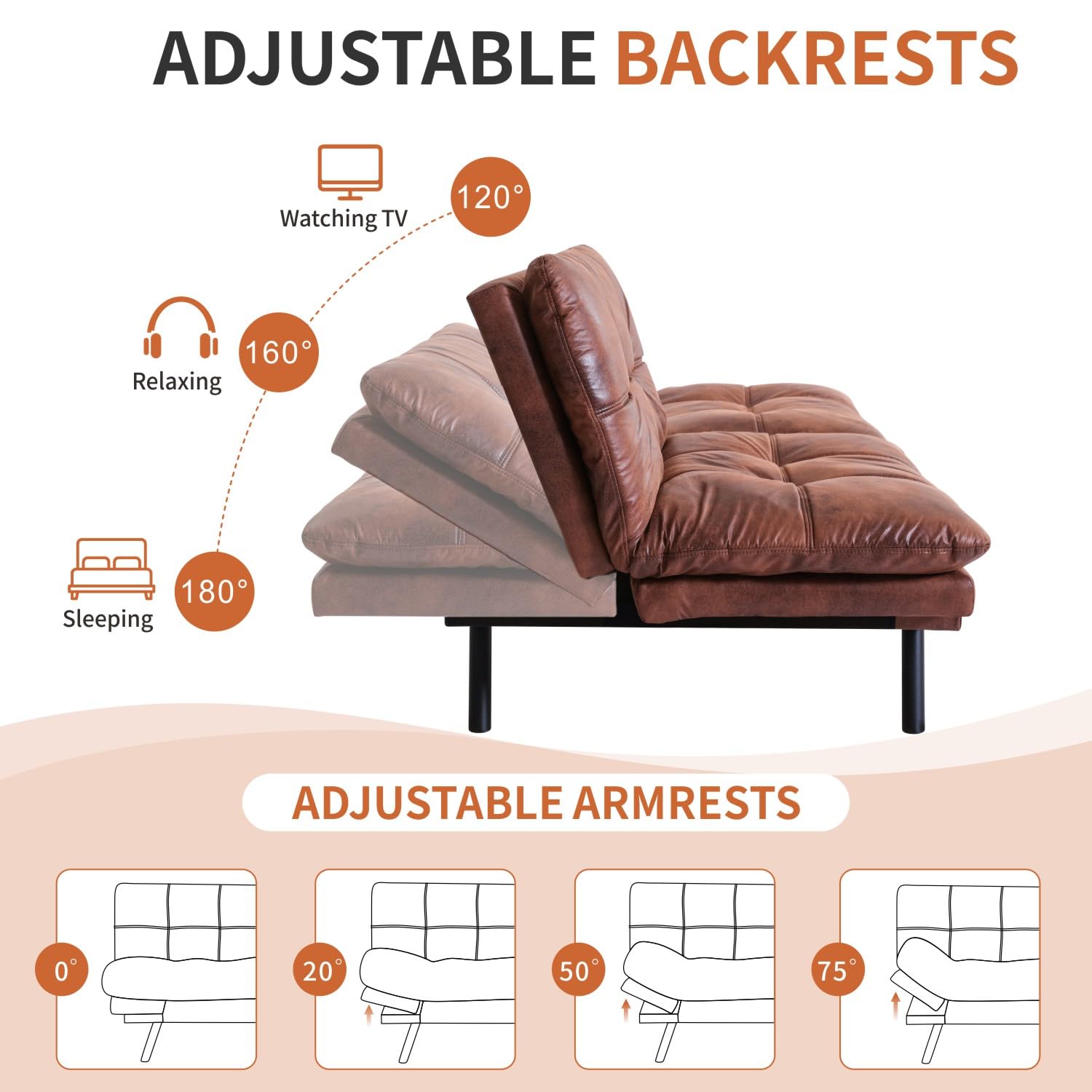 Transform your living space with this versatile convertible futon sofa bed. The adjustable backrest (120-180°) and armrests (135-180°) allow seamless conversion from sofa to chaise lounge or sleeper bed. The raised armrests double as comfortable sleep pillows.