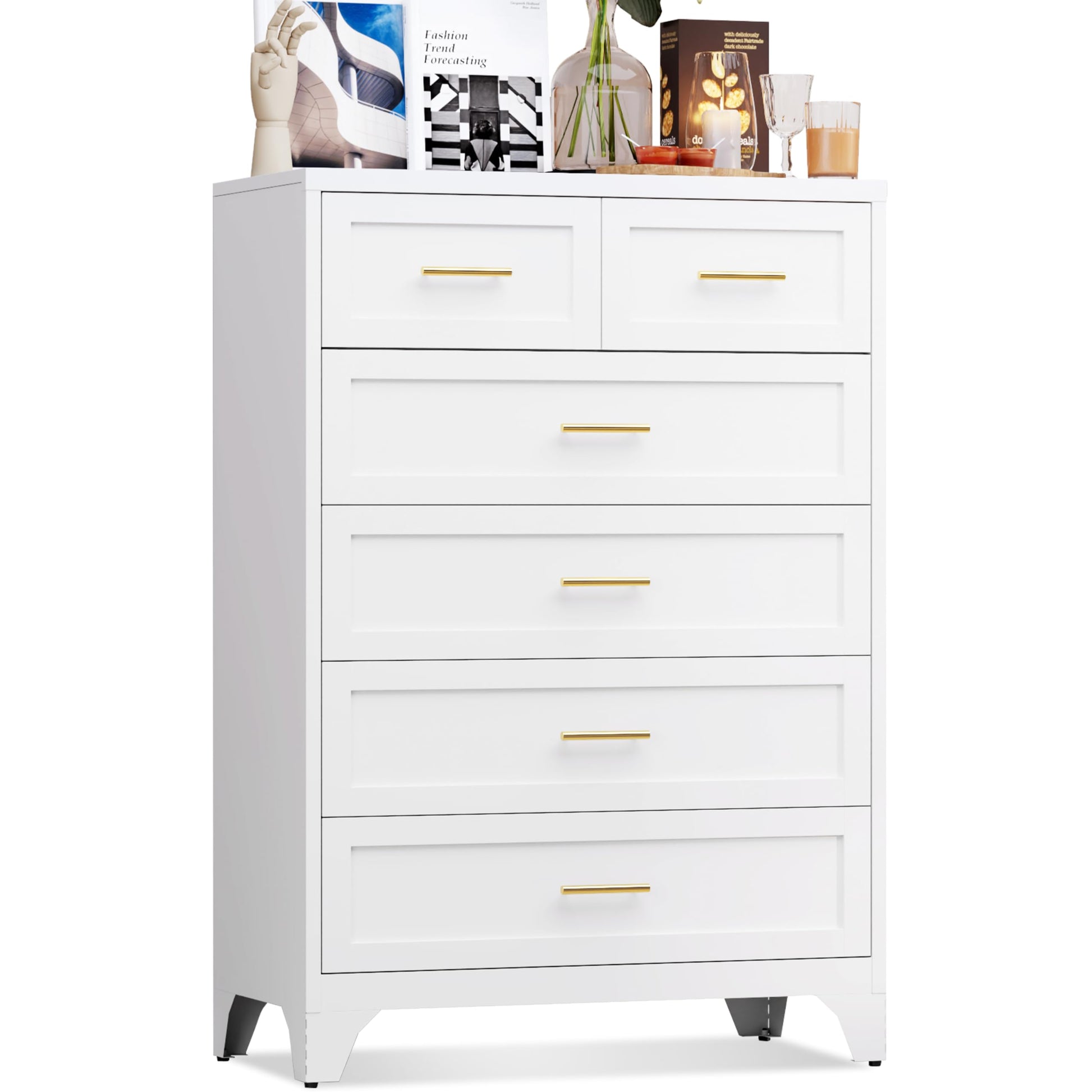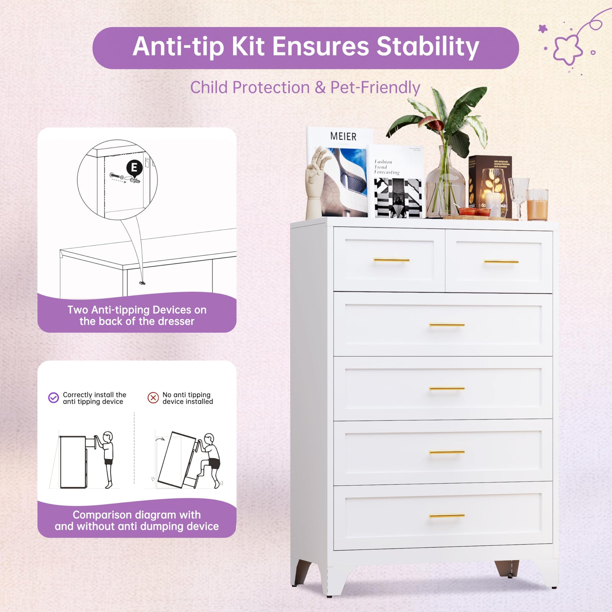 This tall white chest of drawers combines modern design with practical storage solutions. Featuring six spacious drawers, this metal dresser provides ample organization space for bedrooms, dressing rooms, living rooms, or hallways.