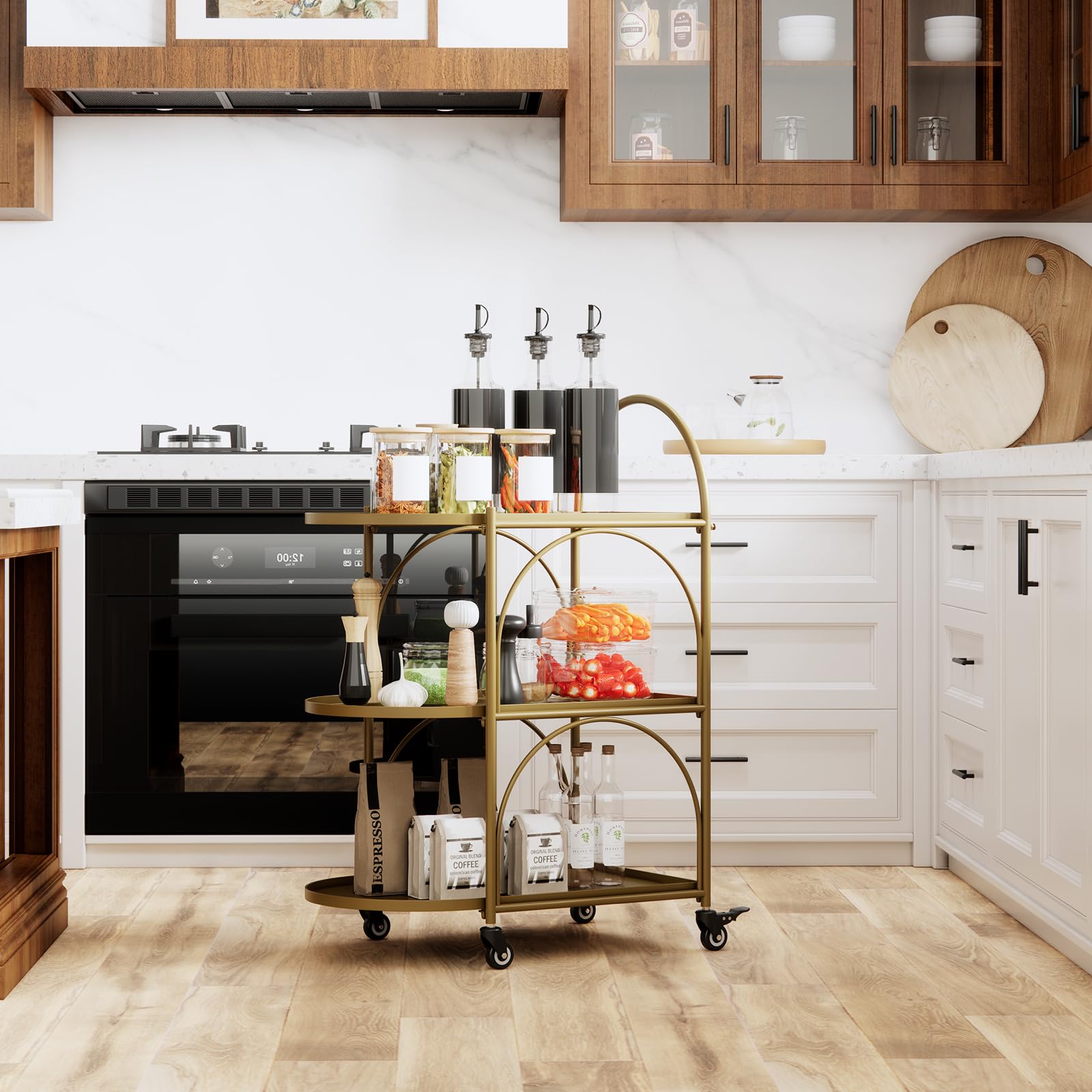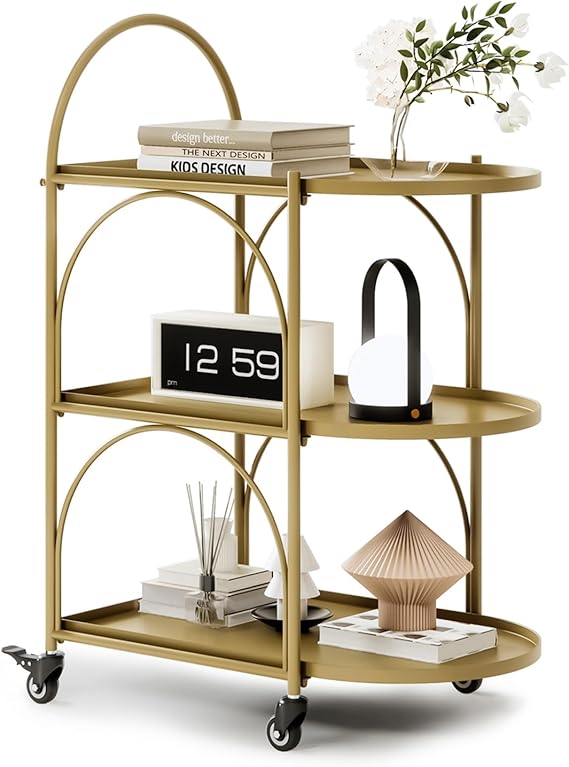 This metal bar cart combines functionality with elegant design, perfect for serving drinks, storing items, or adding a decorative touch to any room.