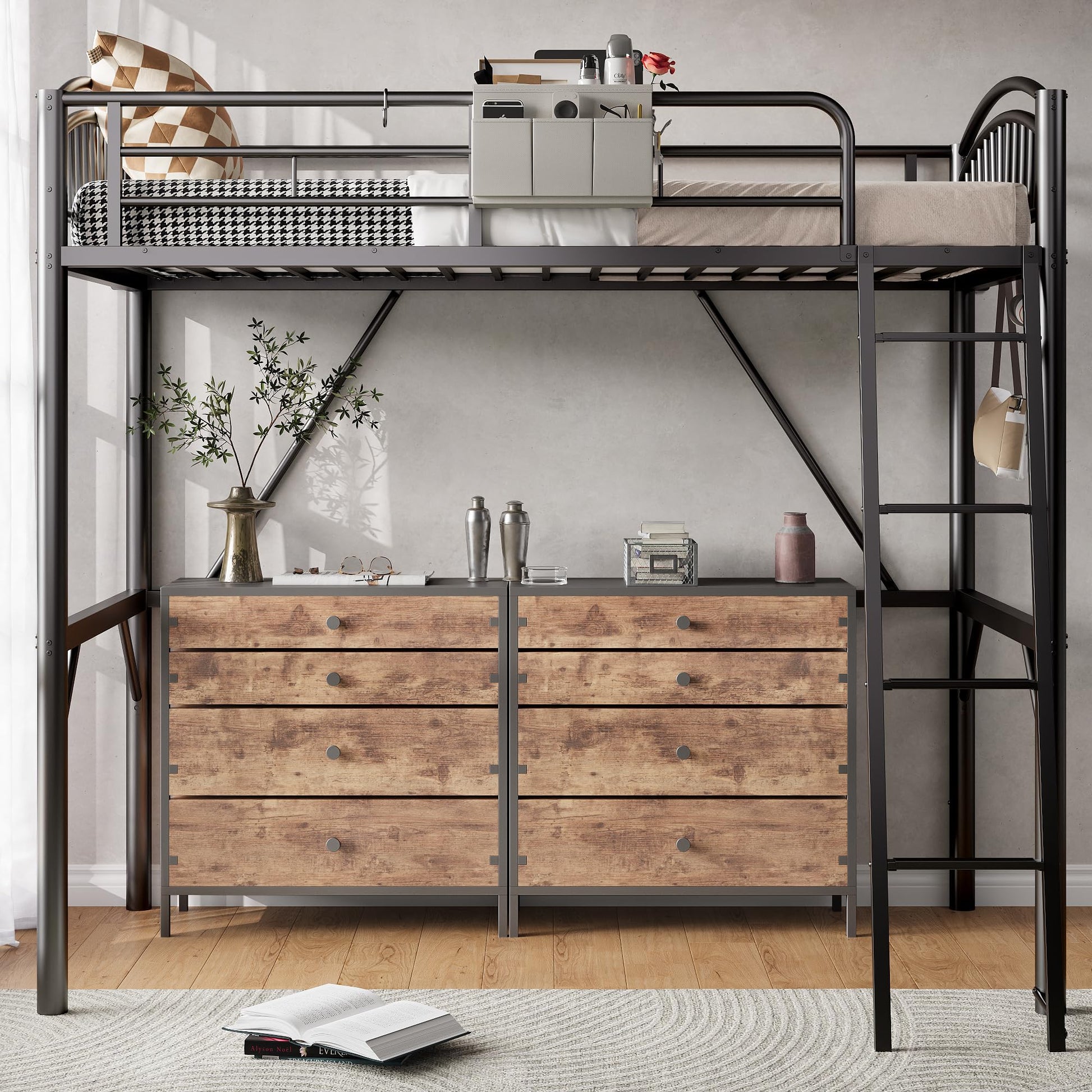 Maximize your bedroom space with this sturdy twin-size metal loft bed. Featuring a convenient bedside caddy, convertible ladder, and full-length guardrails, this elevated bed frame creates valuable floor space underneath for a desk, seating area, or storage.