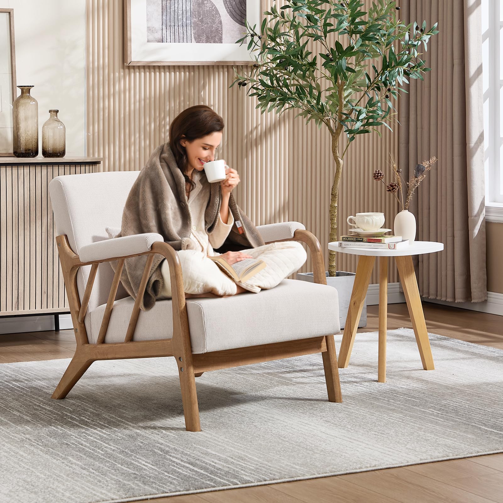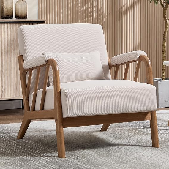 This mid-century modern accent chair combines timeless design with exceptional comfort. Featuring a solid wood frame, thickly padded armrests, and an included lumbar pillow, this upholstered armchair provides relaxing support for reading, lounging, or enjoying quiet moments.