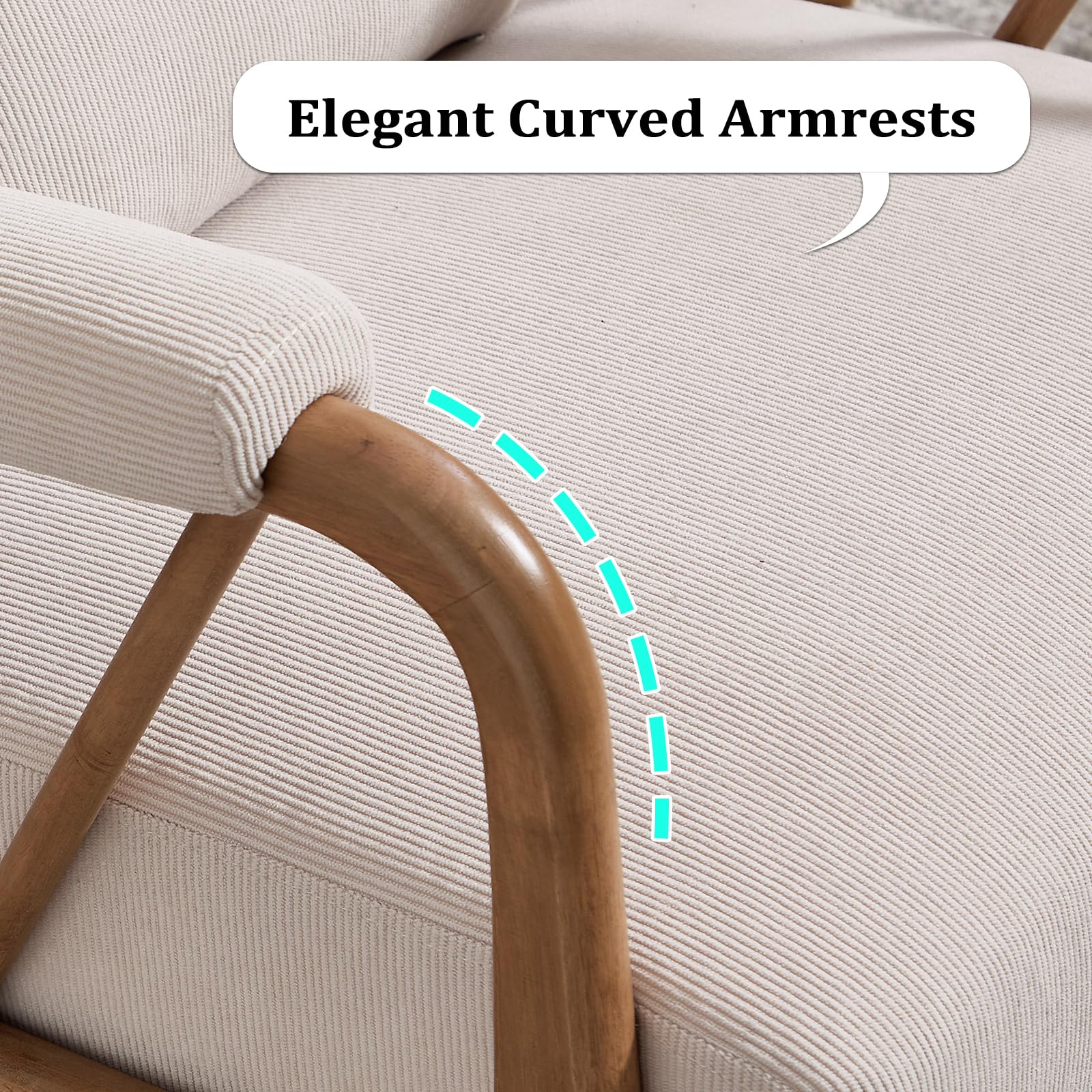 The chair showcases classic cream corduroy upholstery with decorative solid wood slats on both sides that enhance the mid-century aesthetic while preventing items from slipping off. Built with high-density sponge cushioning and a sturdy frame supporting up to 350 lbs, this versatile piece fits beautifully in living rooms, bedrooms, balconies, or reading nooks.