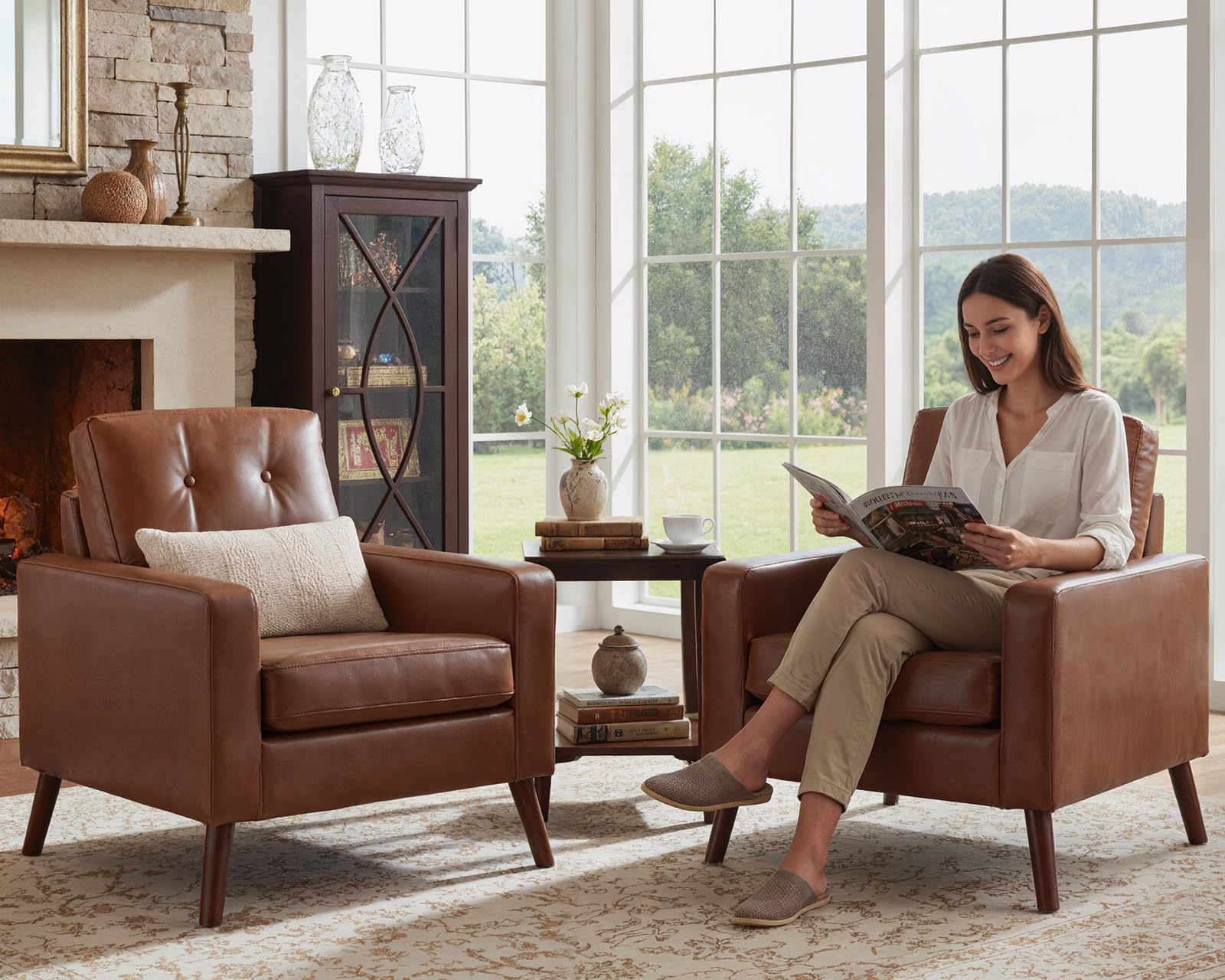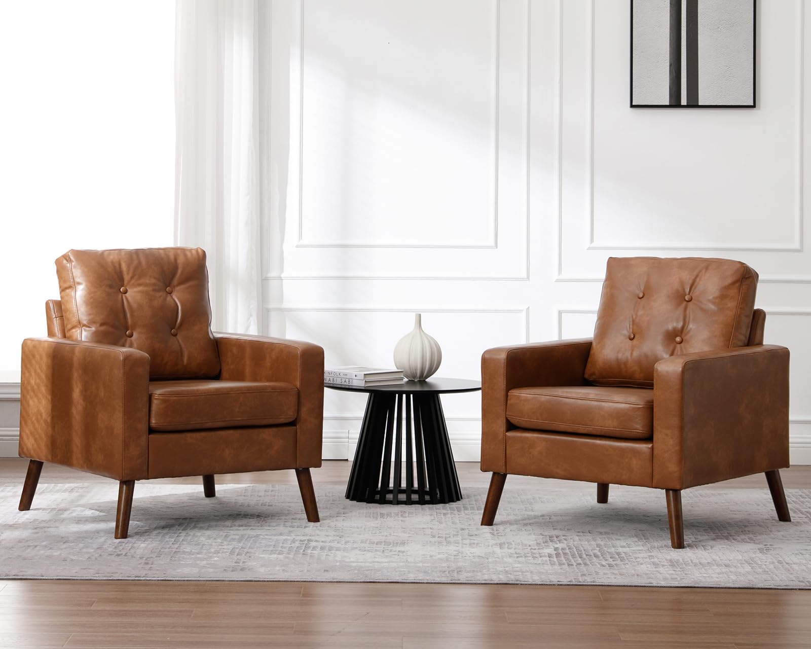 Elevate your living space with this sophisticated set of 2 mid-century modern armchairs. Featuring classic button tufted detailing and premium faux leather upholstery in a warm caramel finish, these accent chairs blend timeless design with contemporary comfort.