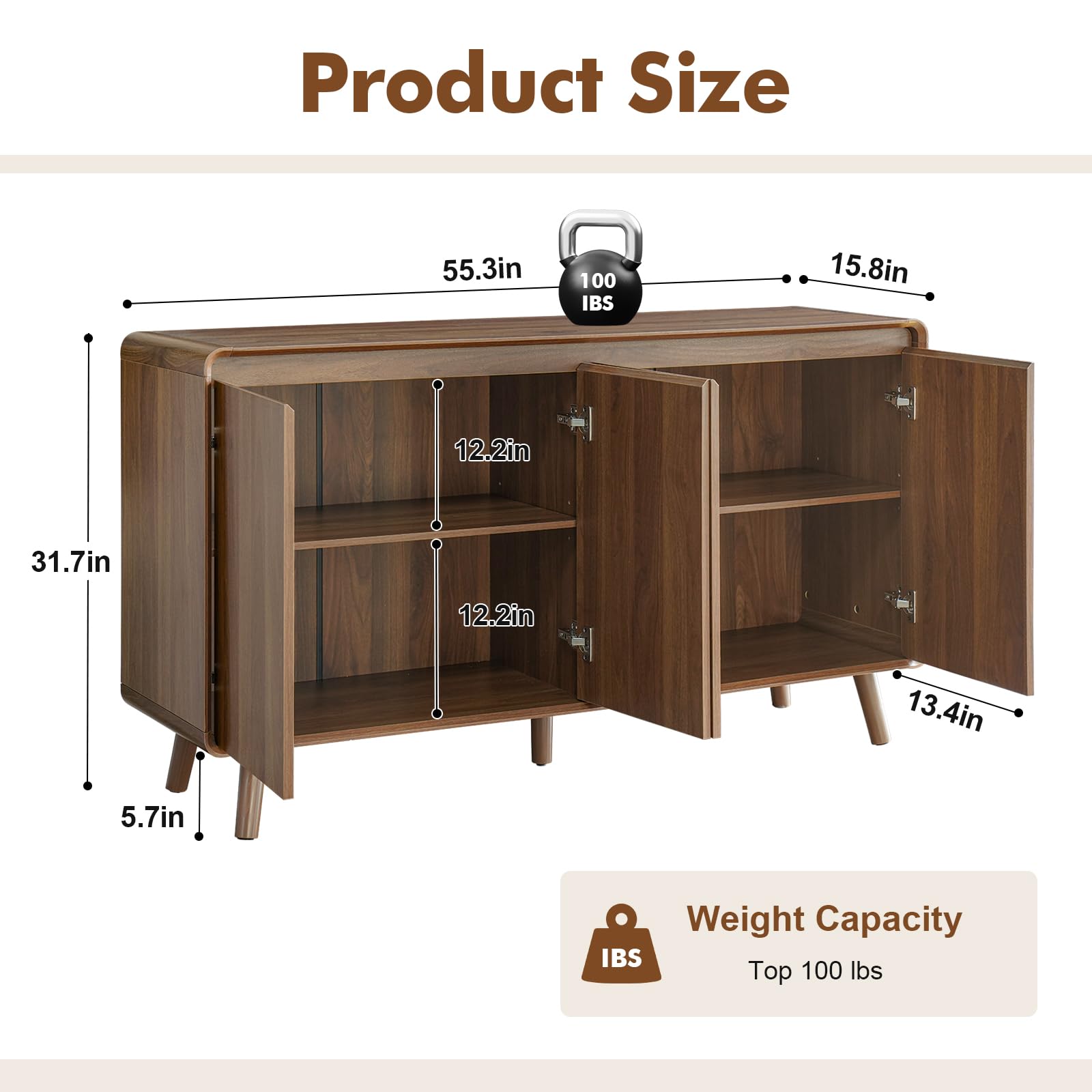This spacious 55-inch buffet cabinet combines mid-century modern elegance with practical storage solutions. Perfect for living rooms, dining rooms, kitchens, or entryways, this versatile piece features adjustable shelves, beveled profile design, and a smooth walnut finish that complements any decor style.