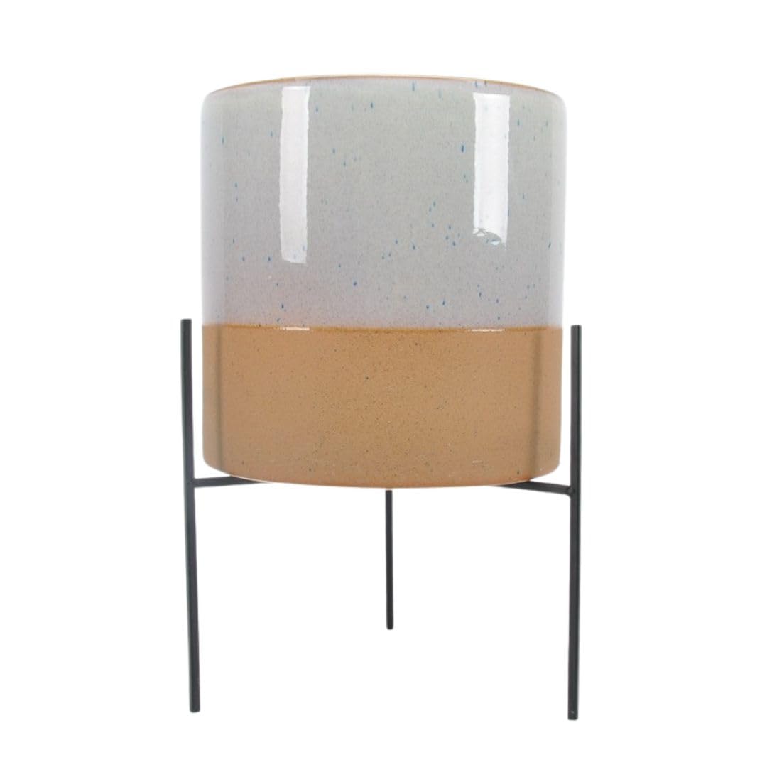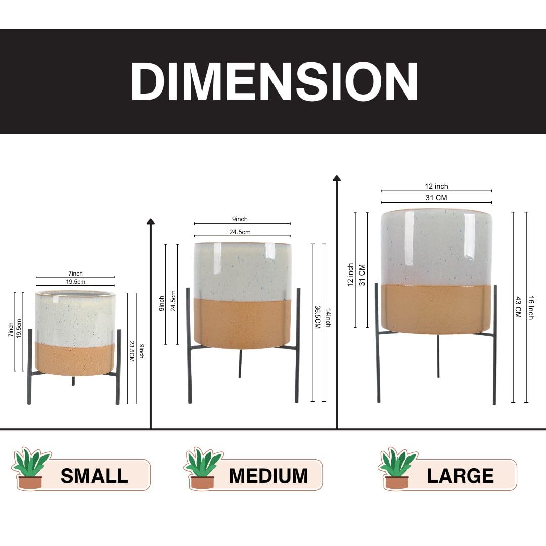 Elevate your indoor plant display with this stunning mid-century modern ceramic planter featuring a sleek black metal stand. The large 16-inch planter showcases a beautiful earthy beige and white glazed finish that adds sophistication to any living space, bedroom, or office.