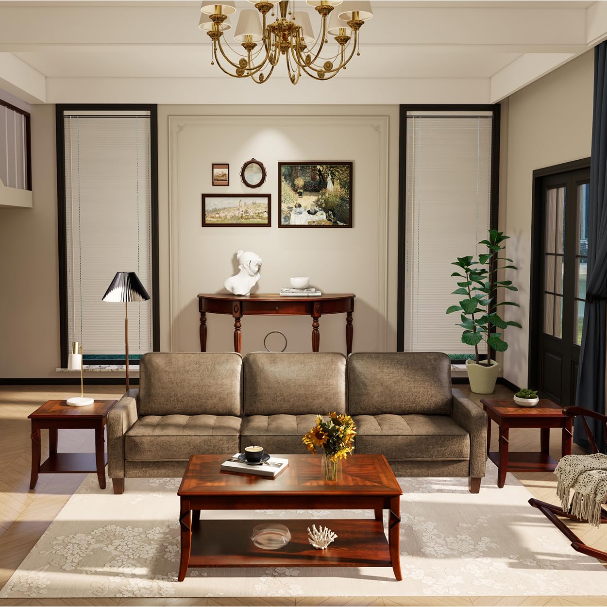 This elegant 3-piece living room table set combines timeless mid-century modern design with solid wood construction. The set includes one coffee table and two square end side tables, perfect for creating a cohesive and functional living space.