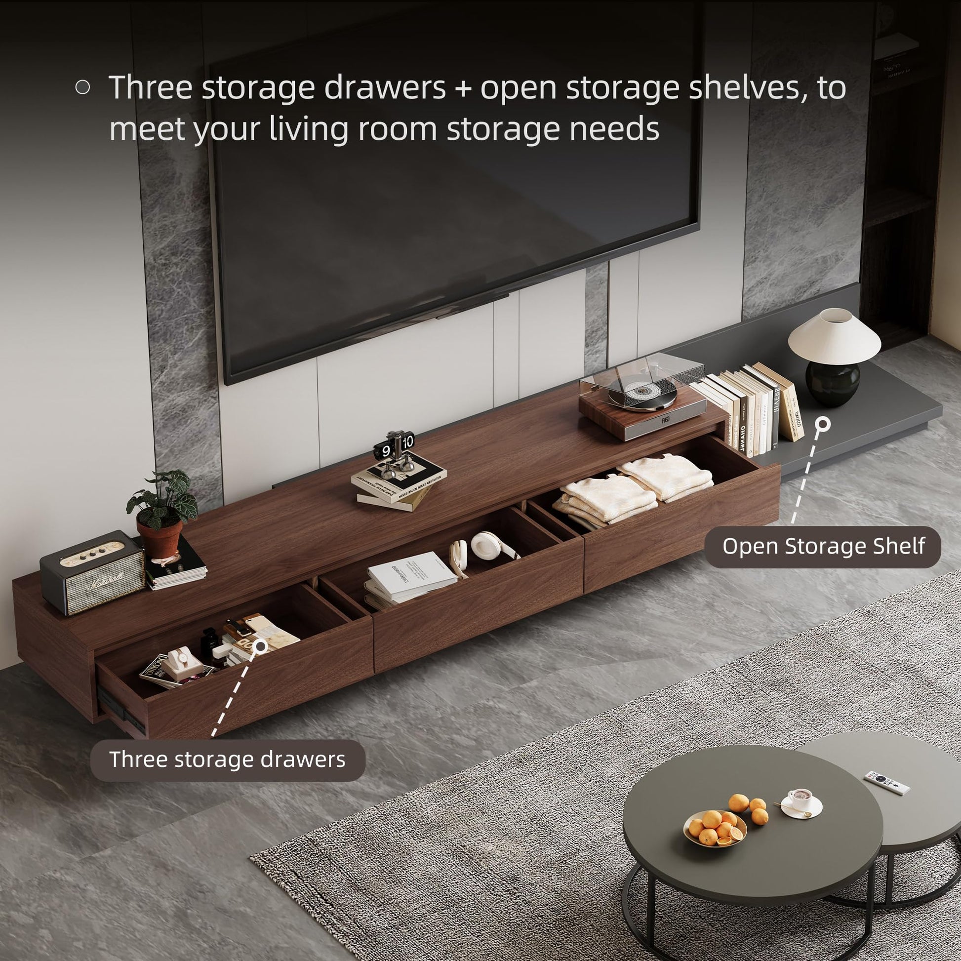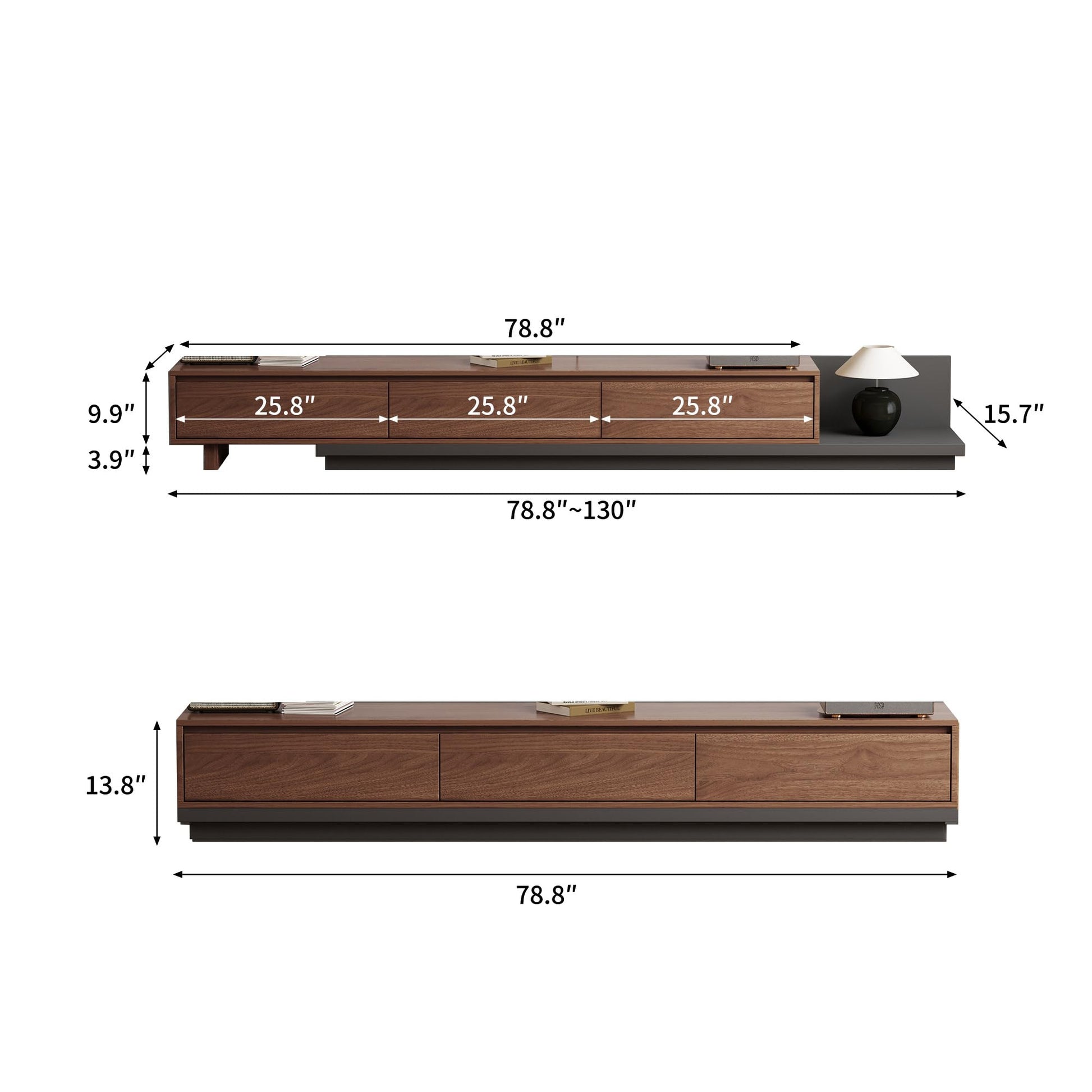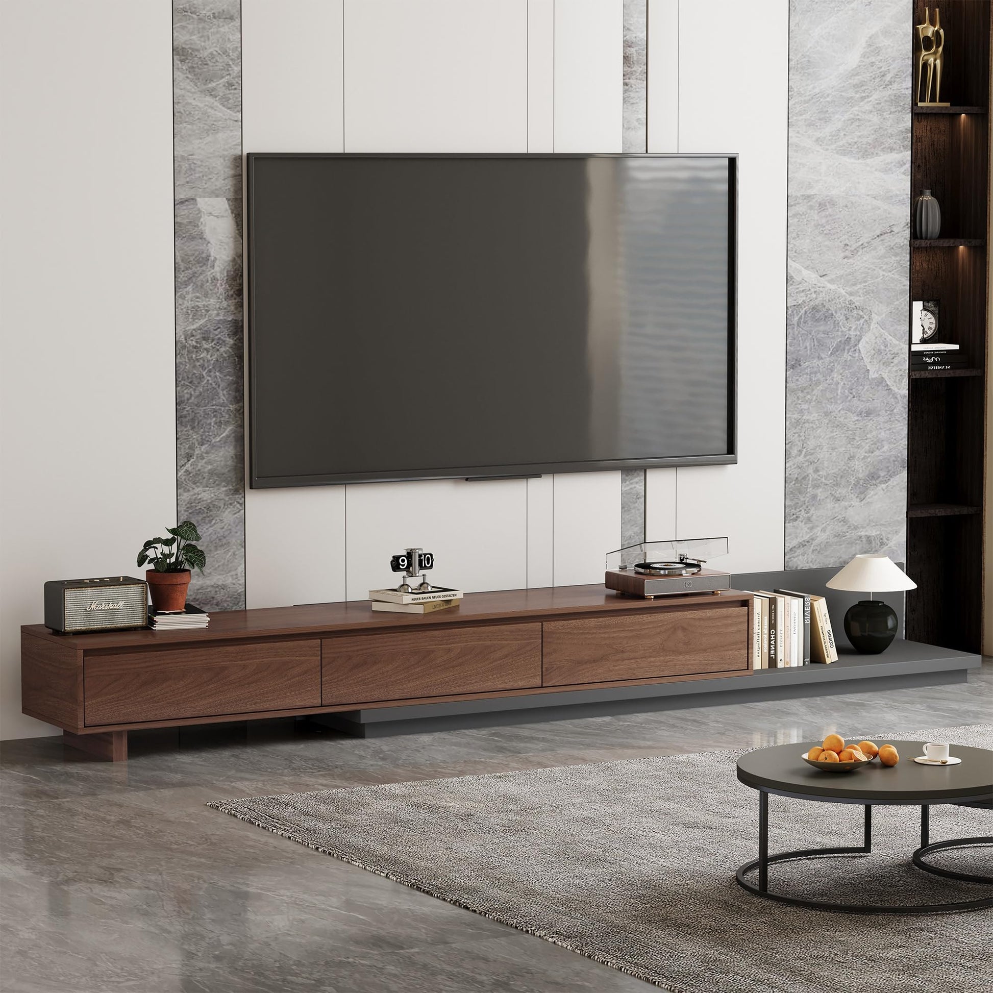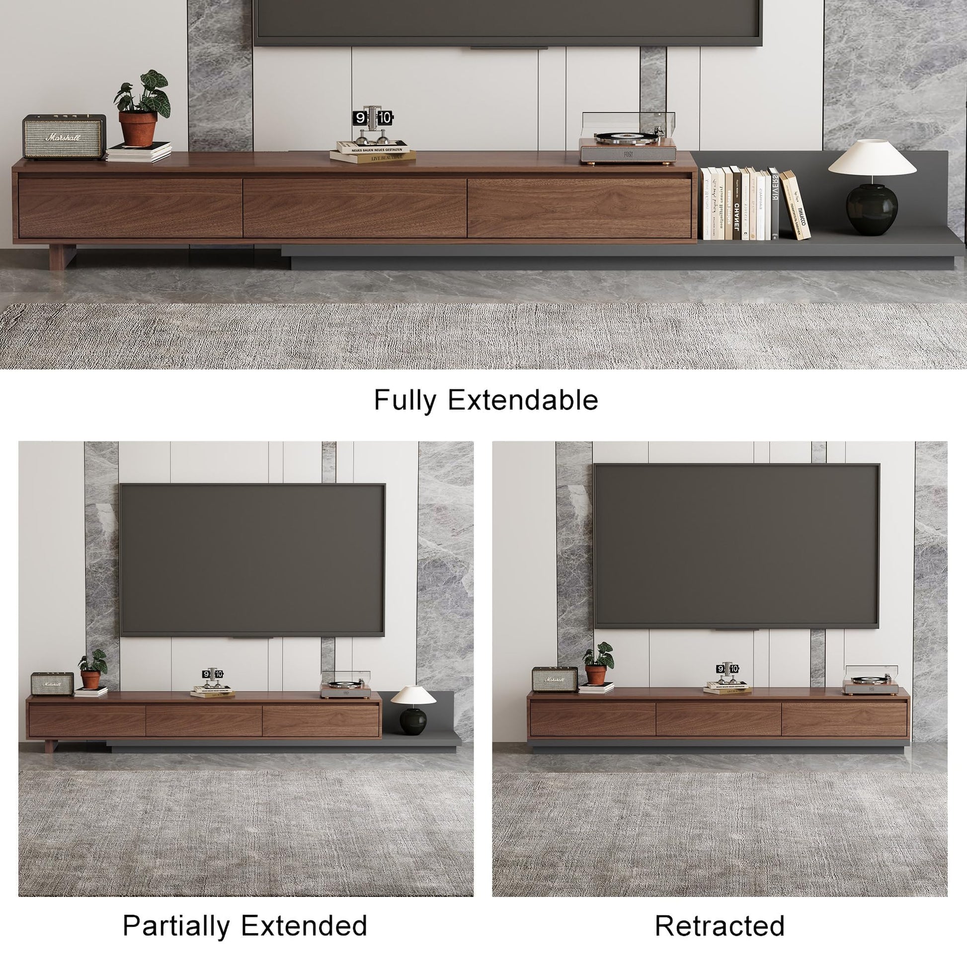 This mid-century modern extendable TV stand combines style and functionality, perfect for contemporary living rooms. The adjustable design extends from 78.7" to 130", accommodating various TV sizes and room layouts.