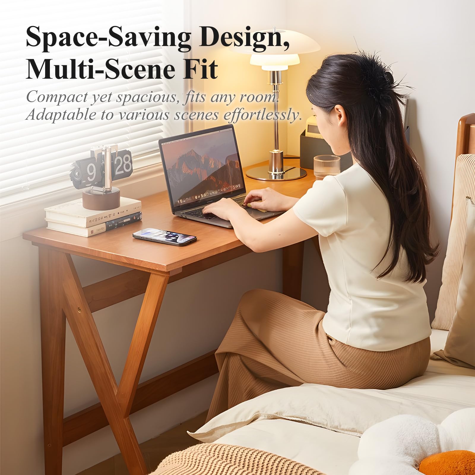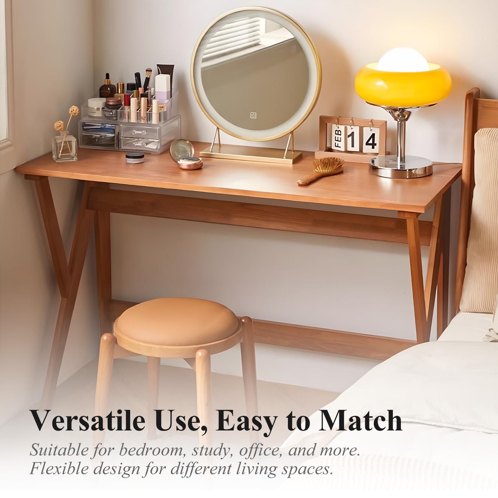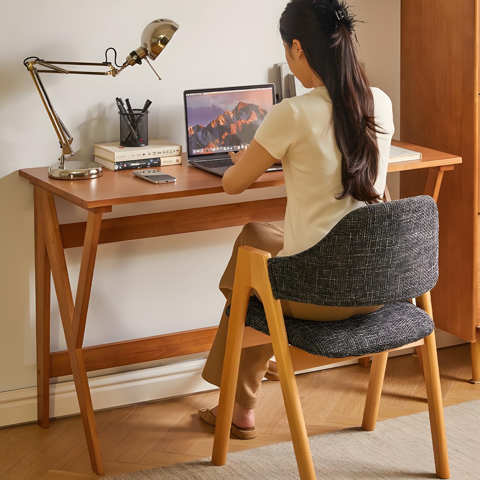 This mid-century modern writing desk combines timeless elegance with contemporary functionality. Featuring sleek lines and a warm oak finish, this desk seamlessly adapts to any modern workspace while maintaining a clean, minimalist aesthetic.