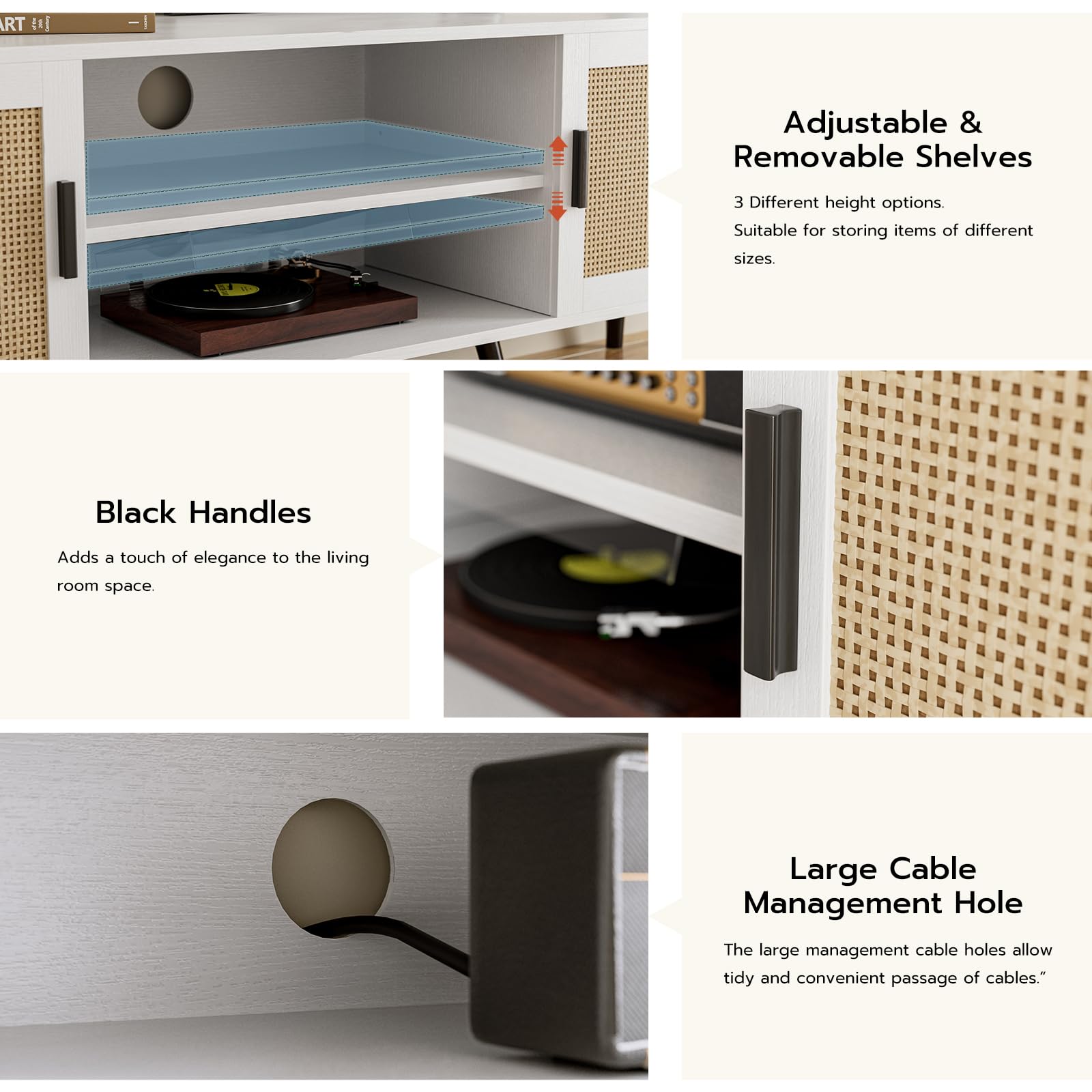 This entertainment center is ideal for those seeking a blend of mid-century modern and bohemian style with practical storage solutions. The natural white finish and rattan door accents create a sophisticated look while providing functional organization for your media equipment, gaming consoles, and decorative items.