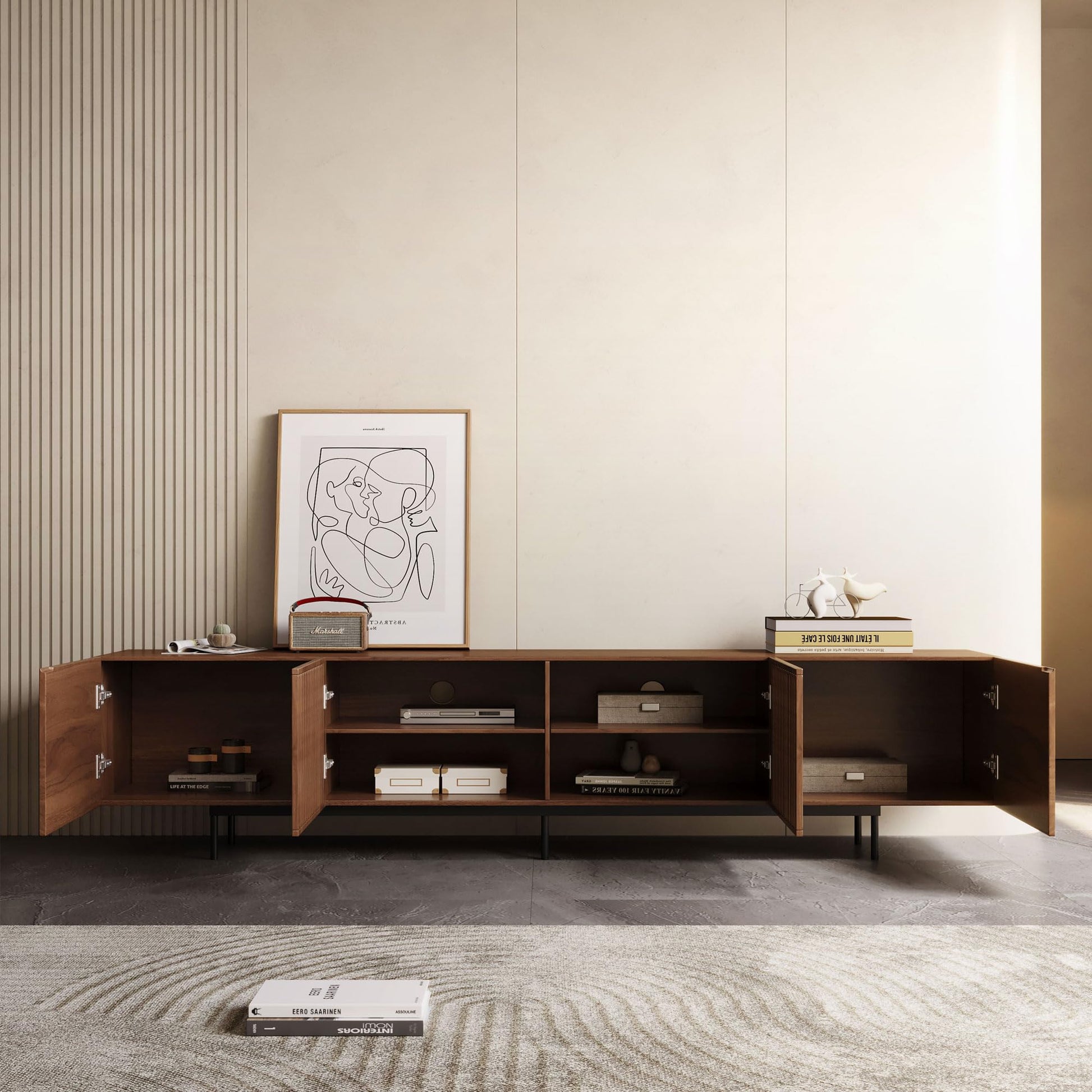 Transform your living space with this elegant mid-century modern TV stand designed to accommodate televisions 80 inches and larger. Crafted with premium walnut finish, this entertainment center combines timeless style with practical functionality.