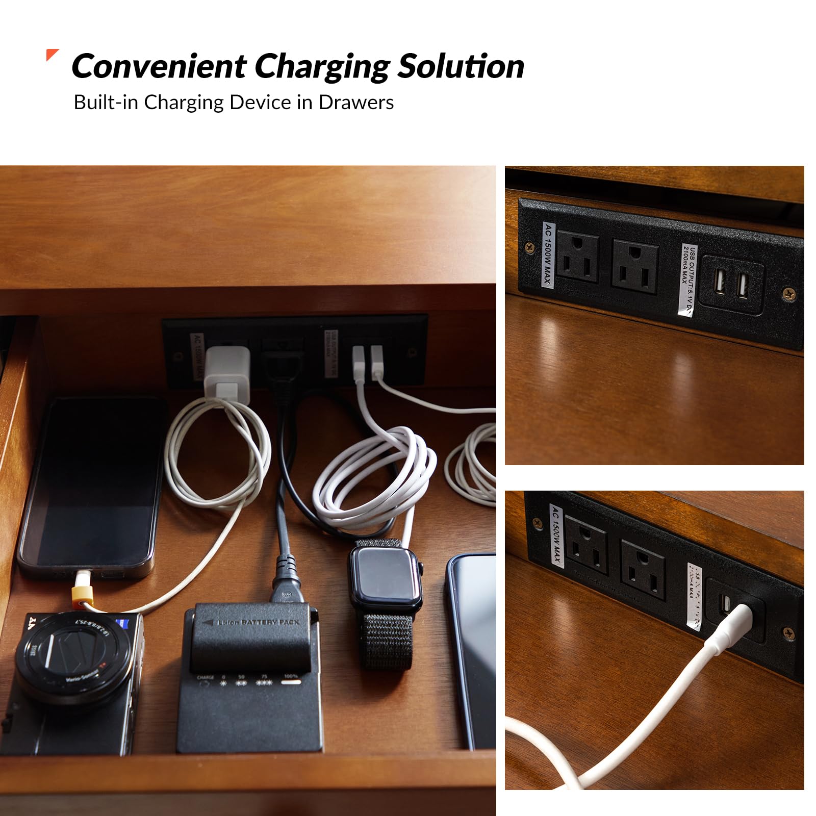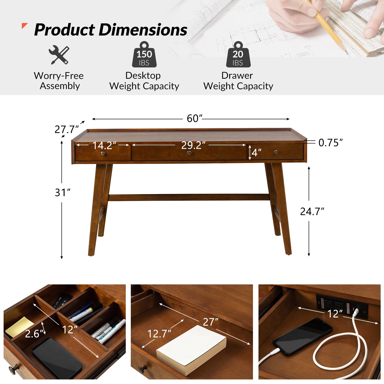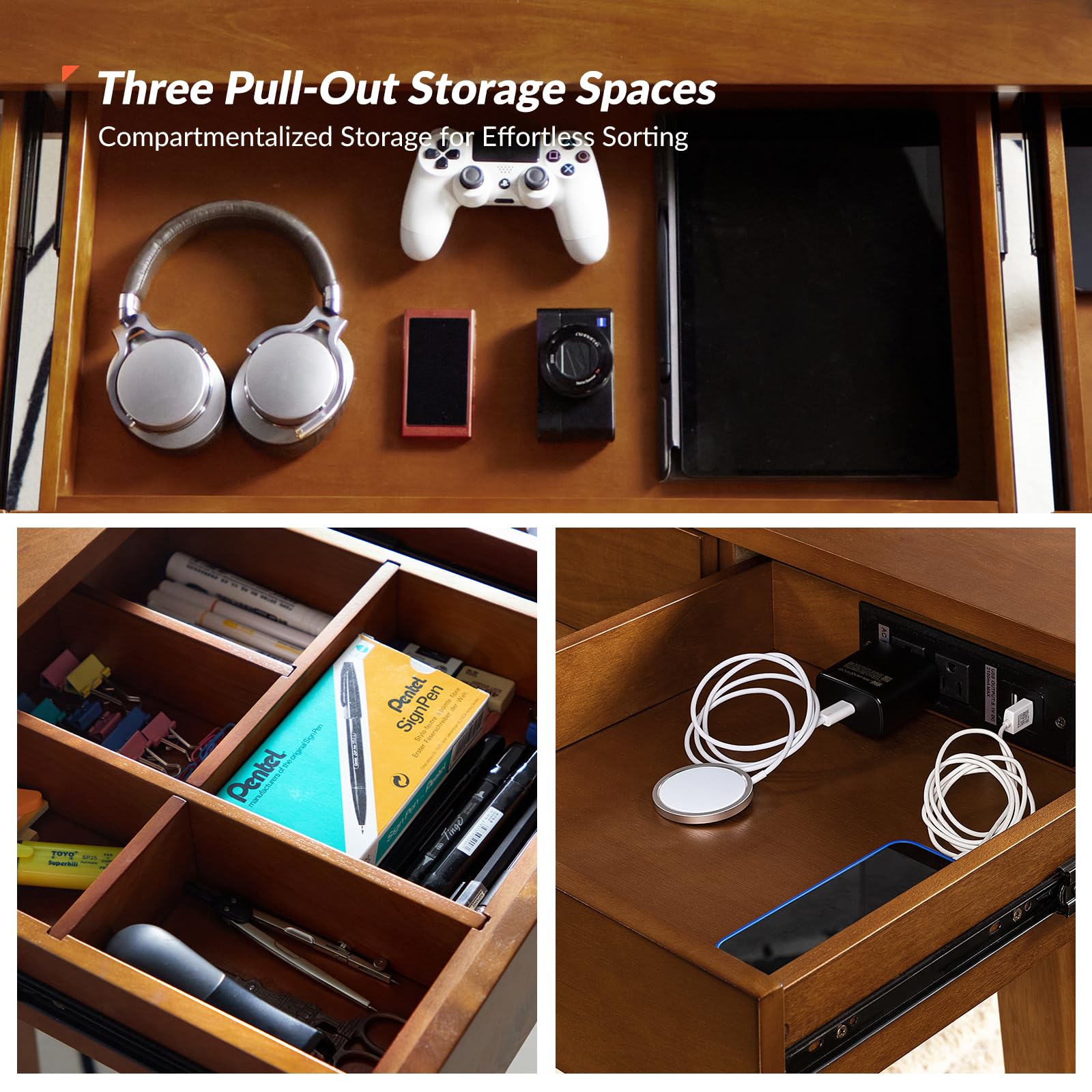 This mid-century modern writing desk combines timeless elegance with practical functionality. Featuring three spacious drawers and a built-in charging station, this desk is perfect for home offices, bedrooms, living rooms, or study spaces. The walnut finish and solid wood legs create a sophisticated aesthetic while providing exceptional durability.
