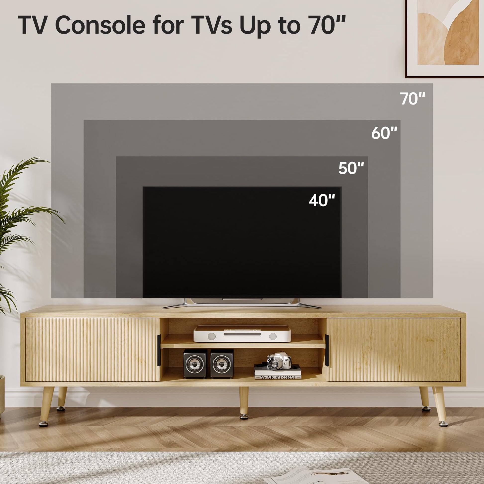 This modern entertainment center combines sleek mid-century design with practical storage solutions. Designed to accommodate TVs up to 70 inches, this console brings both style and functionality to your living room or home office.