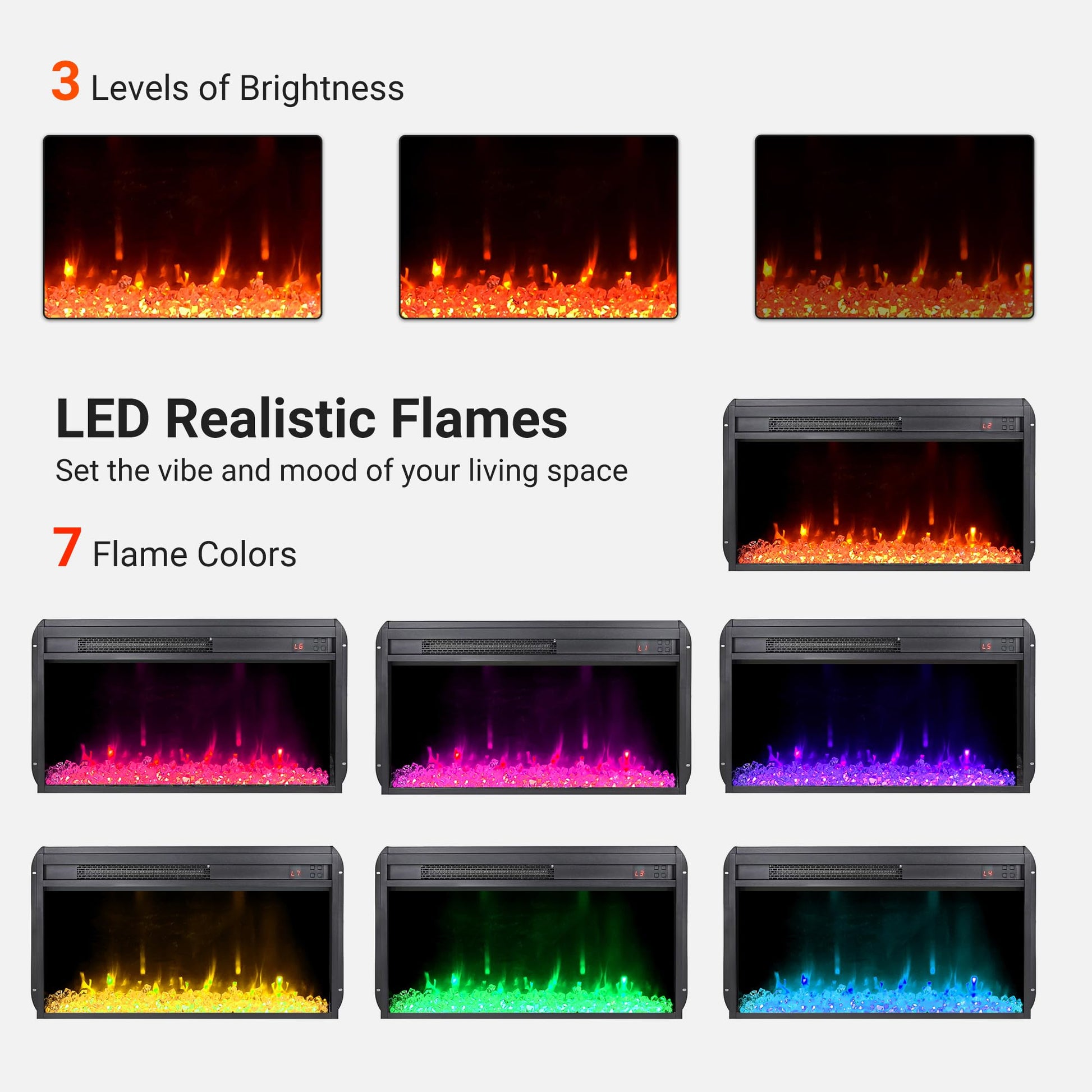 - 7 flame and ember bed colors with 3 adjustable brightness levels
