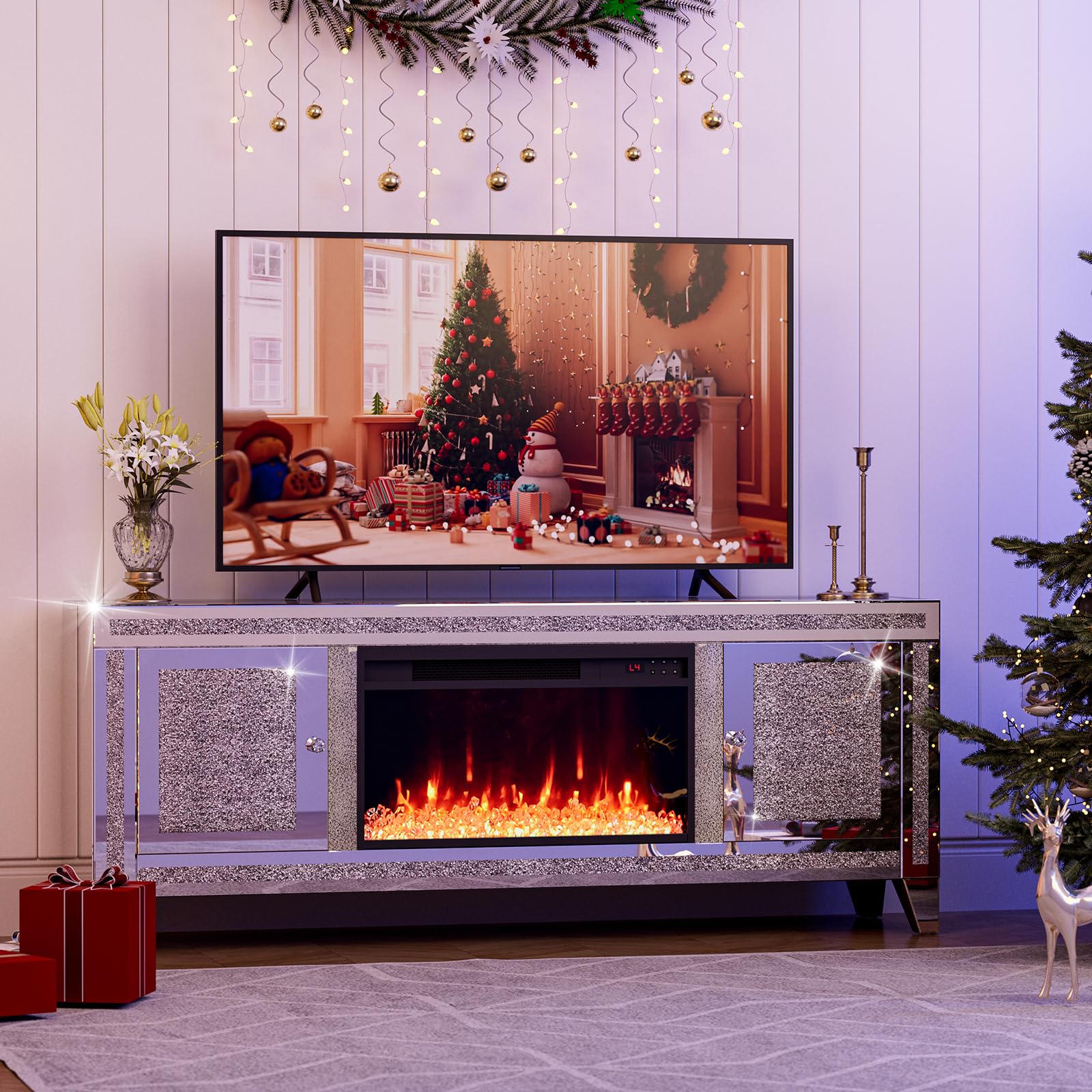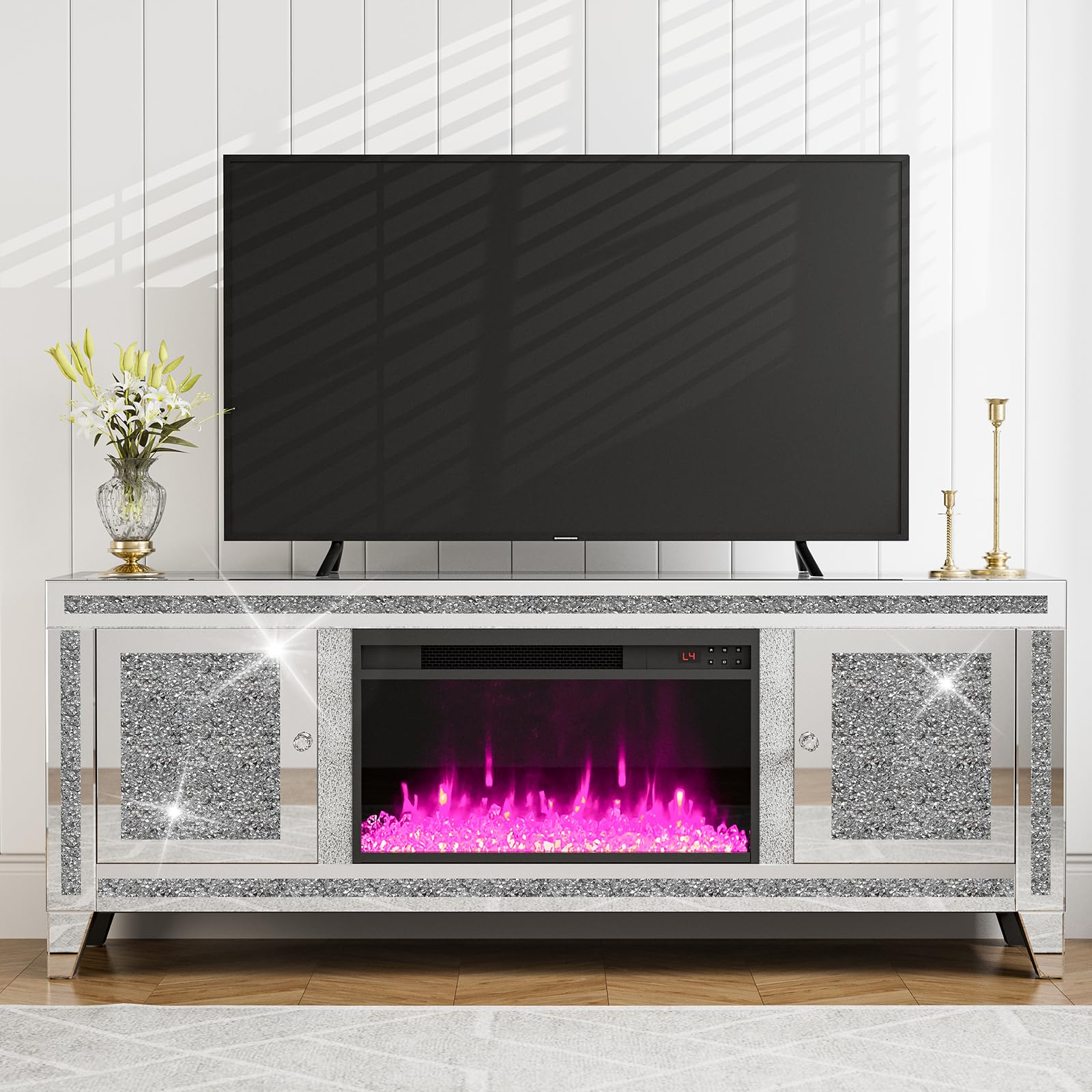 Transform your living space with this modern luxury mirrored TV stand featuring an integrated 26-inch electric fireplace. The fully mirrored surface with sparkling crushed diamond accents creates a chic, elegant look while reflecting light to enhance the sense of openness in your room.