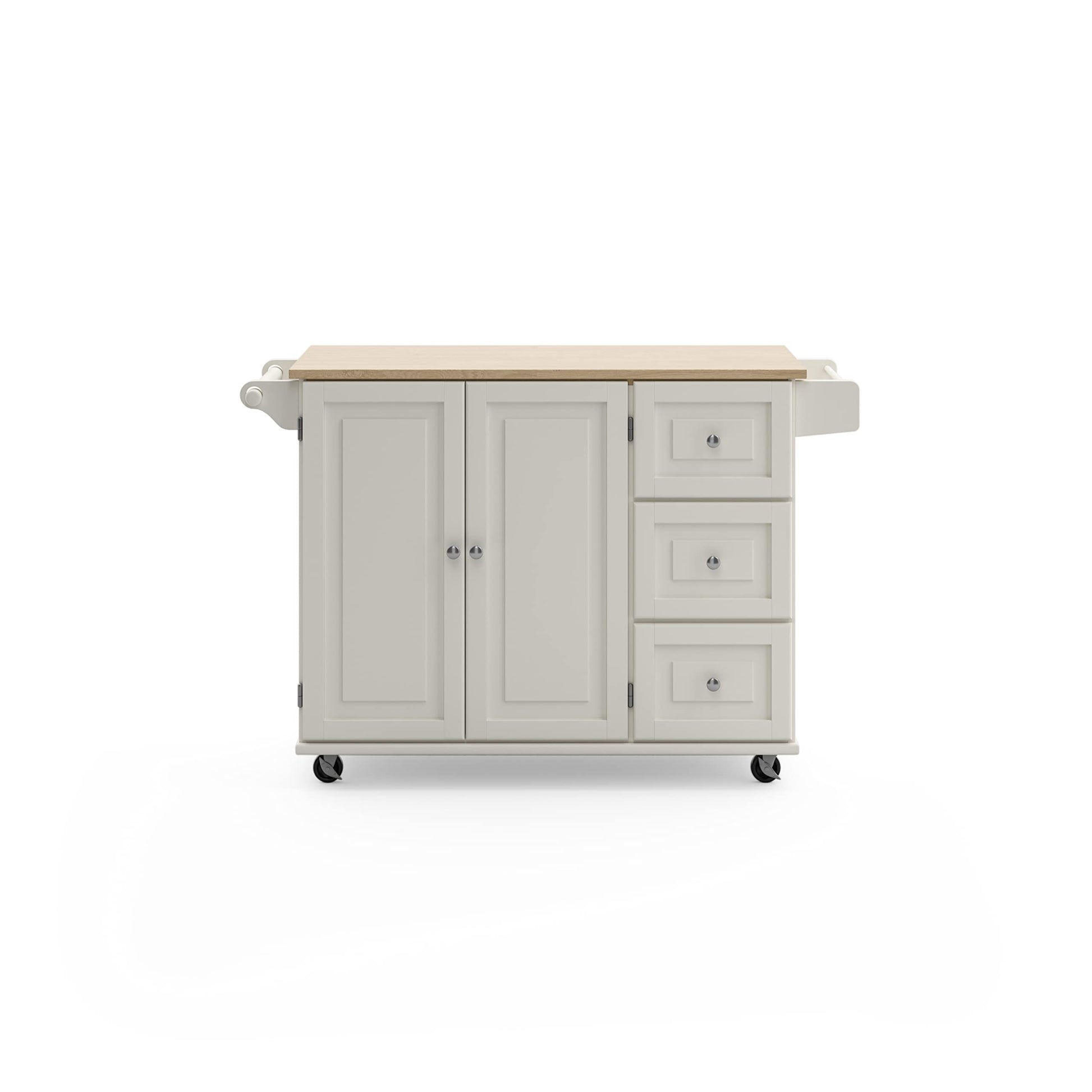 Maximize storage space and work surface in your kitchen with this versatile mobile kitchen cart. The natural solid hardwood surface sits atop a durable engineered wood frame with lockable casters for easy mobility. Features an off-white finish with brushed nickel hardware, combining functionality with classic style.