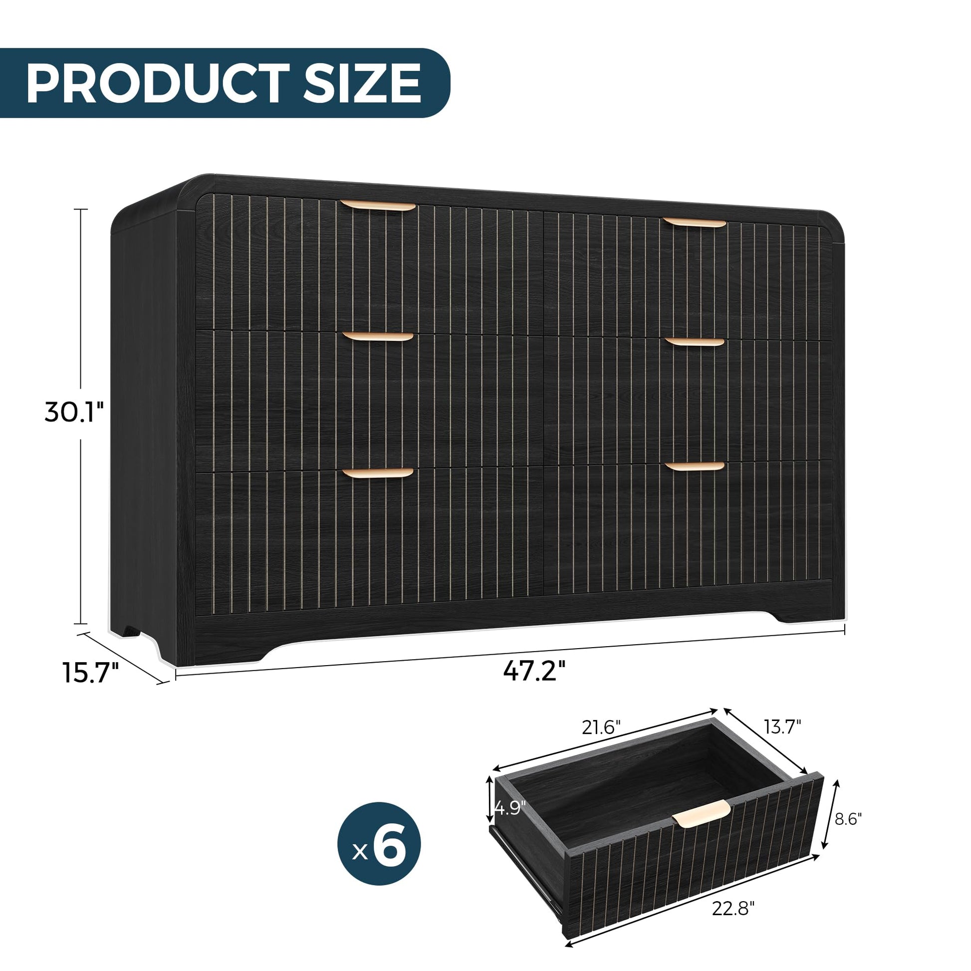 Modern 6 Drawer Dresser - 47" Wide Wood Chest with Curved Fluted Design