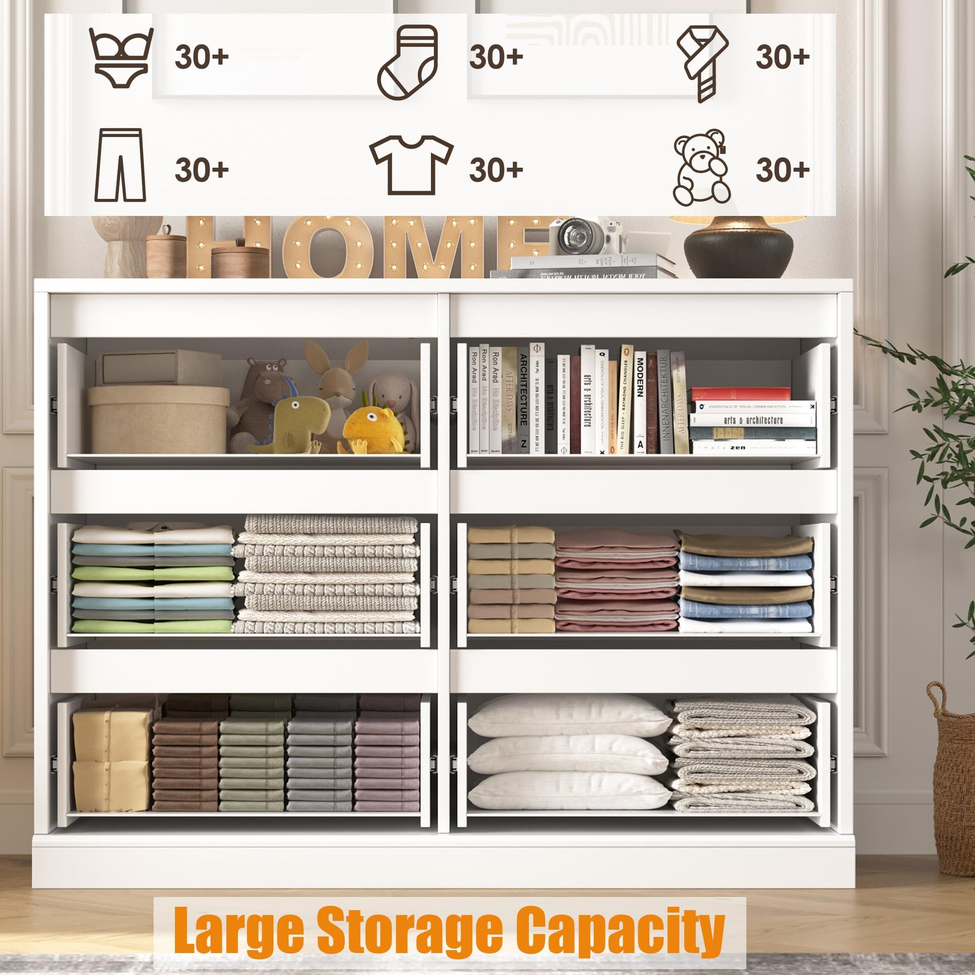 - Six large drawers provide generous storage capacity