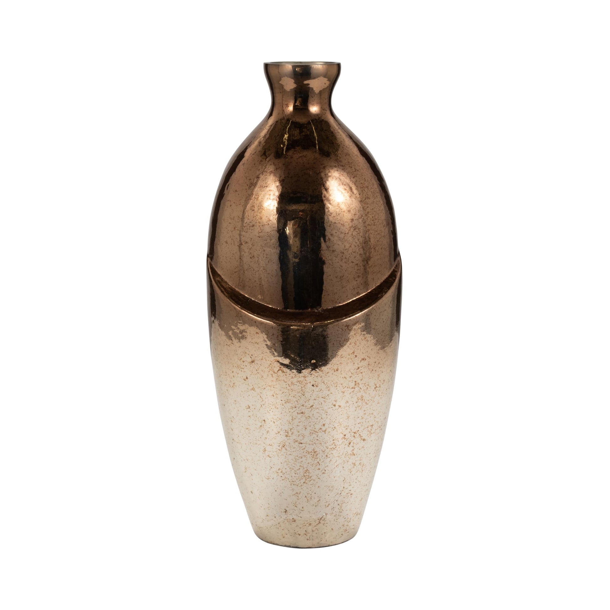 Elevate your interior design with this stunning handcrafted glass vase featuring a unique abstract design. The metallic copper and bronze finish creates a luxurious focal point that complements contemporary and transitional decor styles.