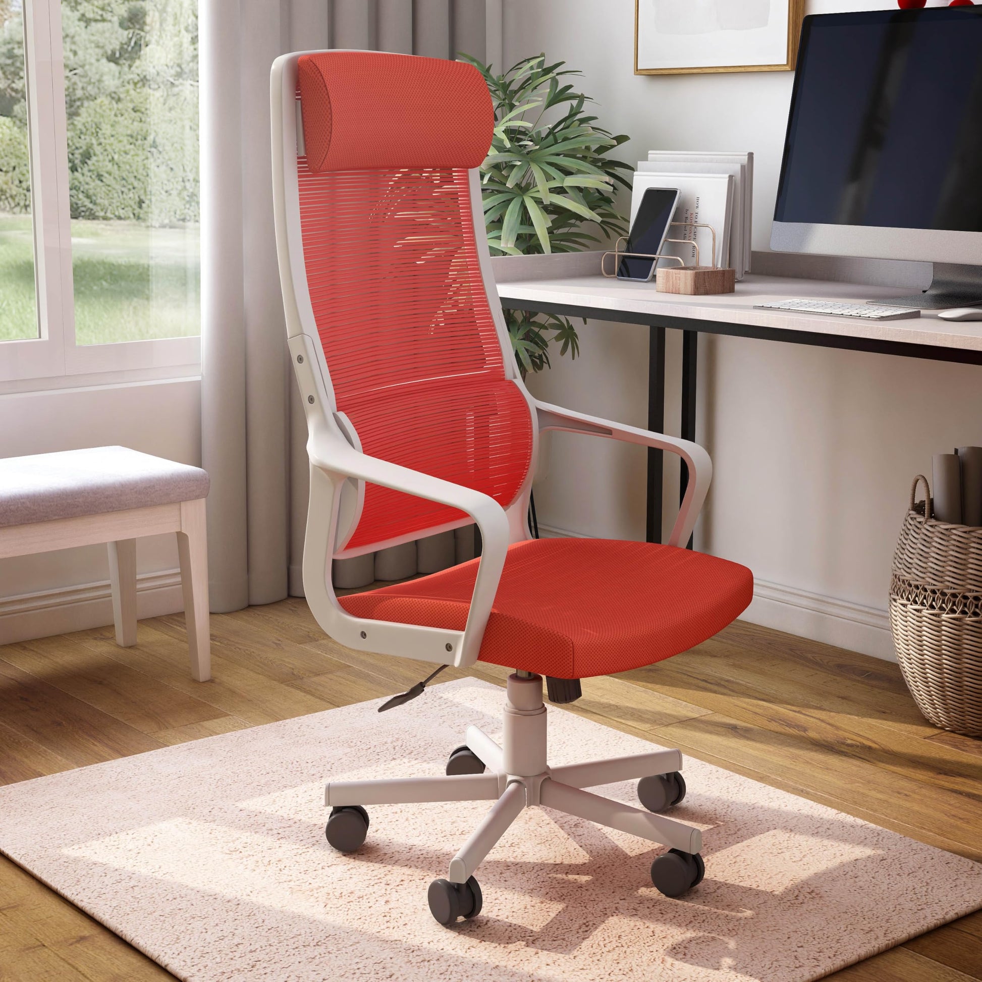 The 360-degree swivel base with smooth-rolling wheels provides effortless mobility, while the adjustable seat height accommodates users of different sizes. The contemporary red and white color scheme adds a vibrant touch to any home office or workspace.