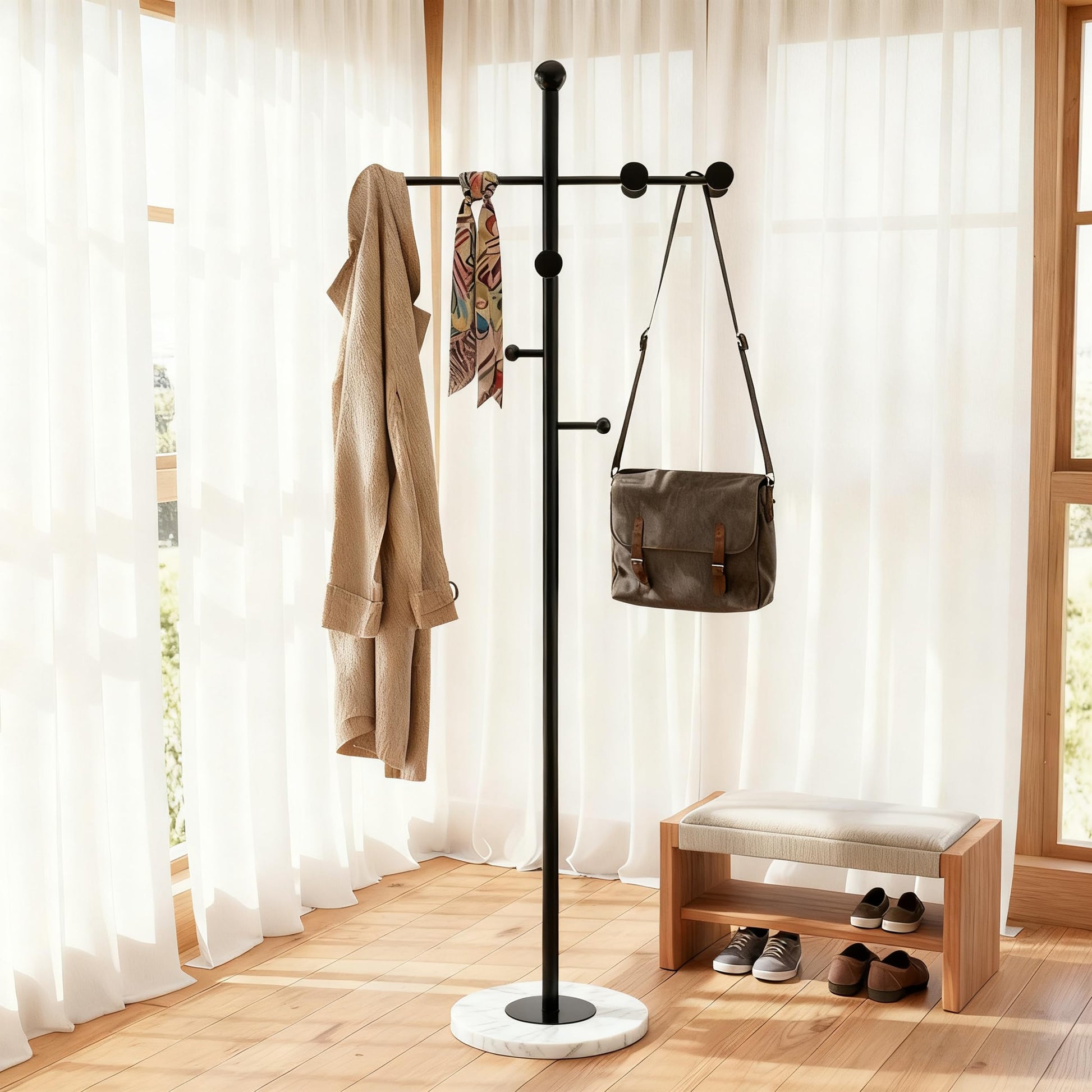 This freestanding coat rack features a heavy-duty metal structure anchored by a substantial round marble base, providing exceptional stability for up to 66 pounds of daily items like coats, bags, and hats without wobbling.