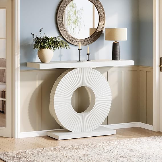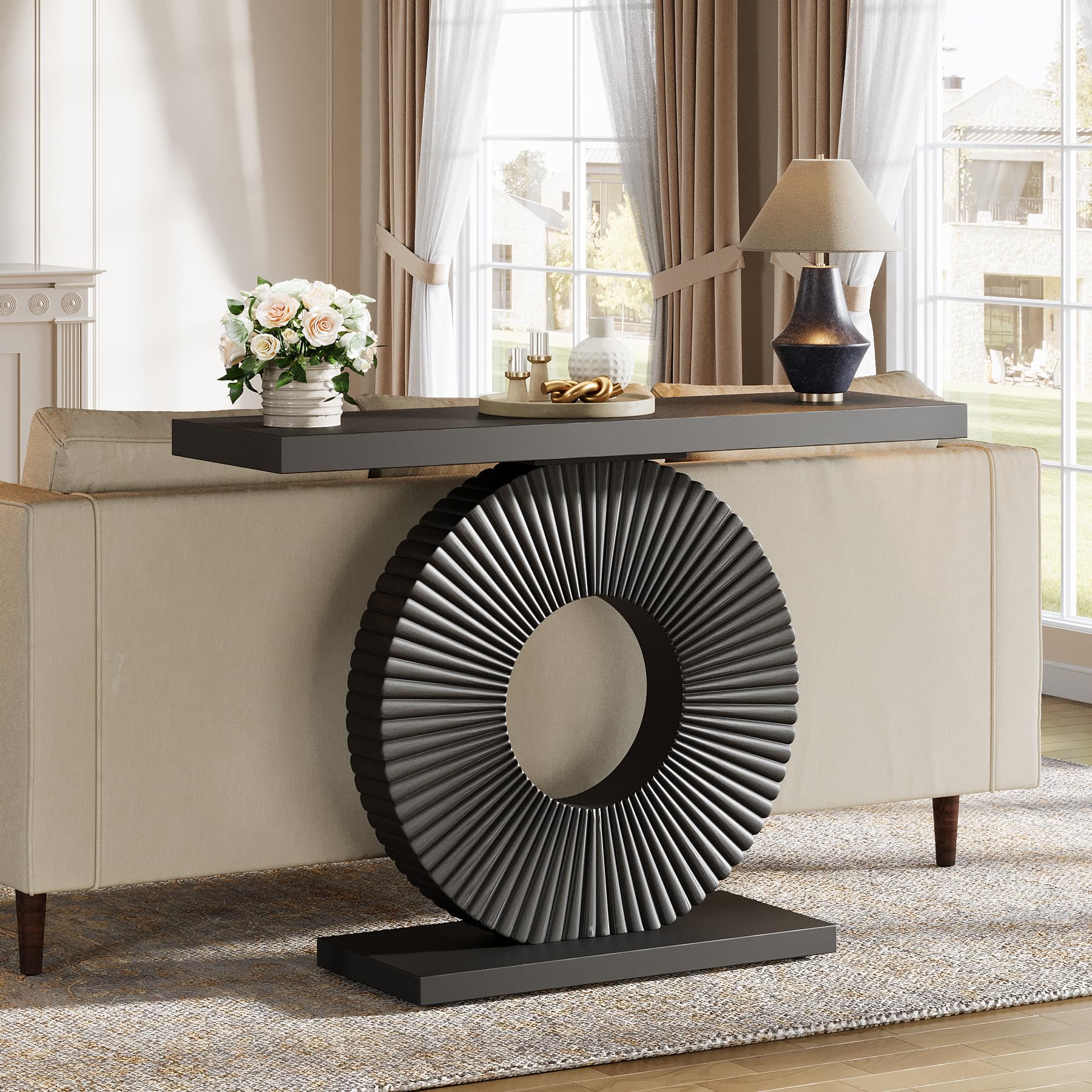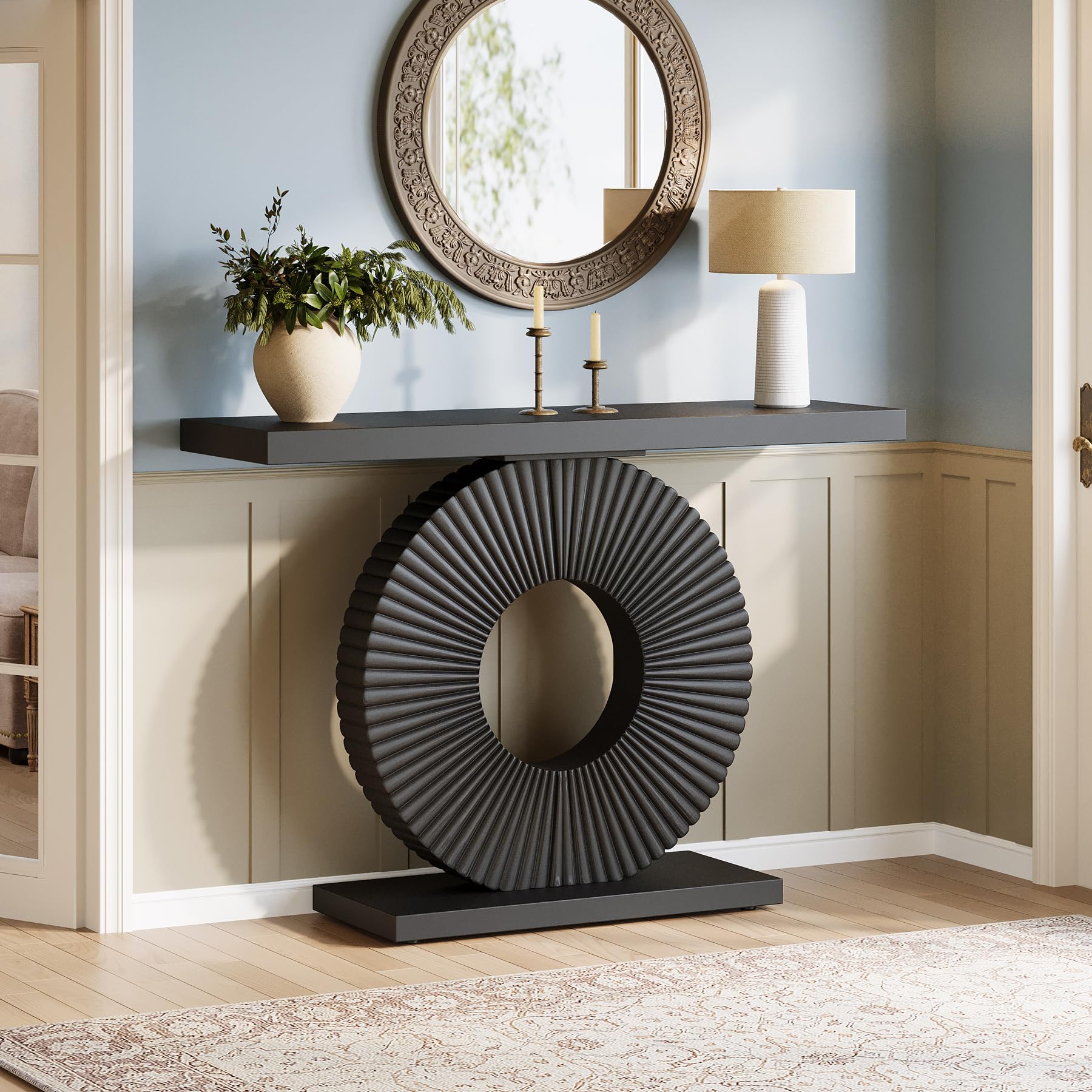 This modern console table features a distinctive circular fan-shaped stand that creates a unique sculpture-like aesthetic. The simple and elegant black exterior adds a stylish and artistic touch to any home, easily becoming a focal point in your entryway, living room, or hallway.