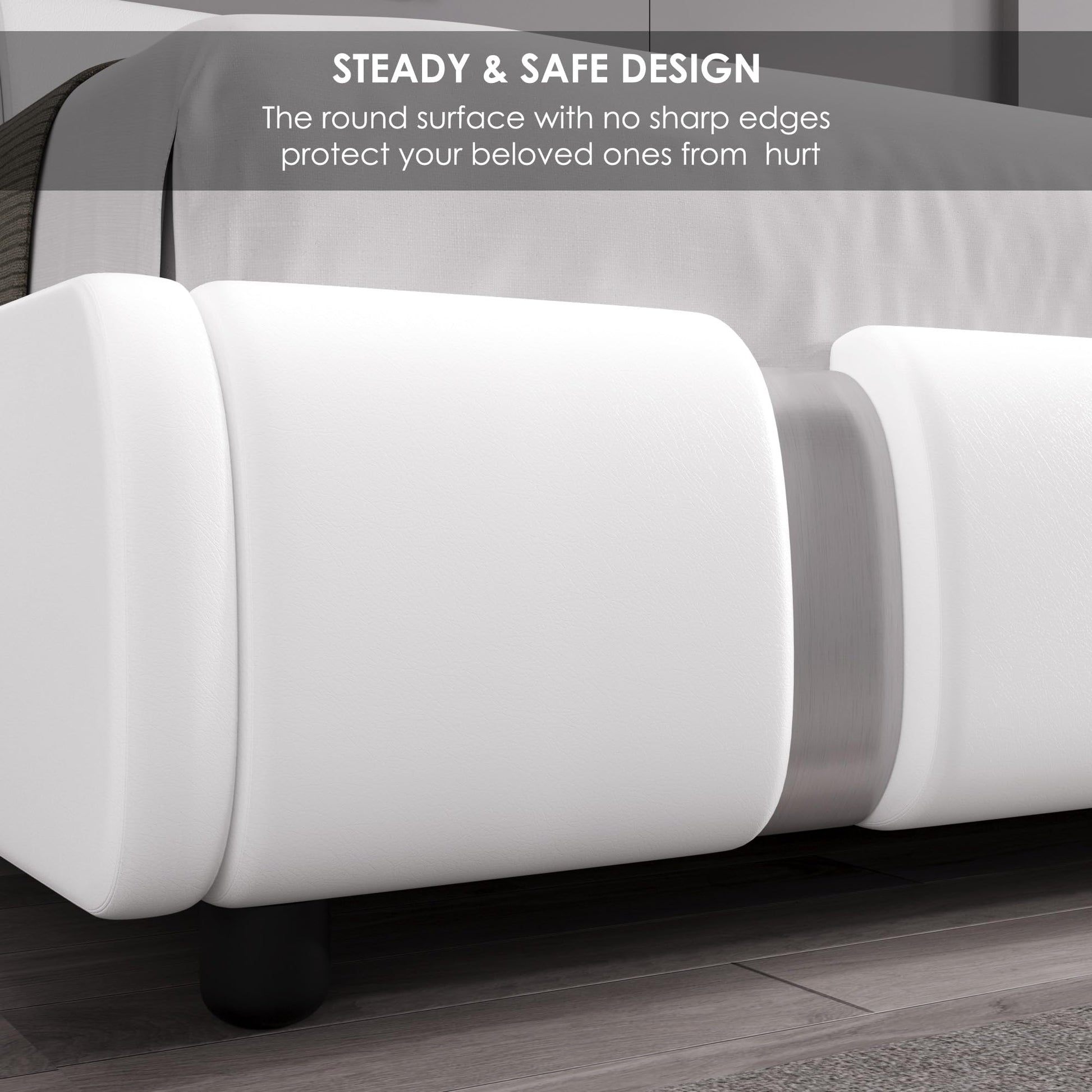- Slanted, curved faux leather headboard doubles as a comfortable backrest