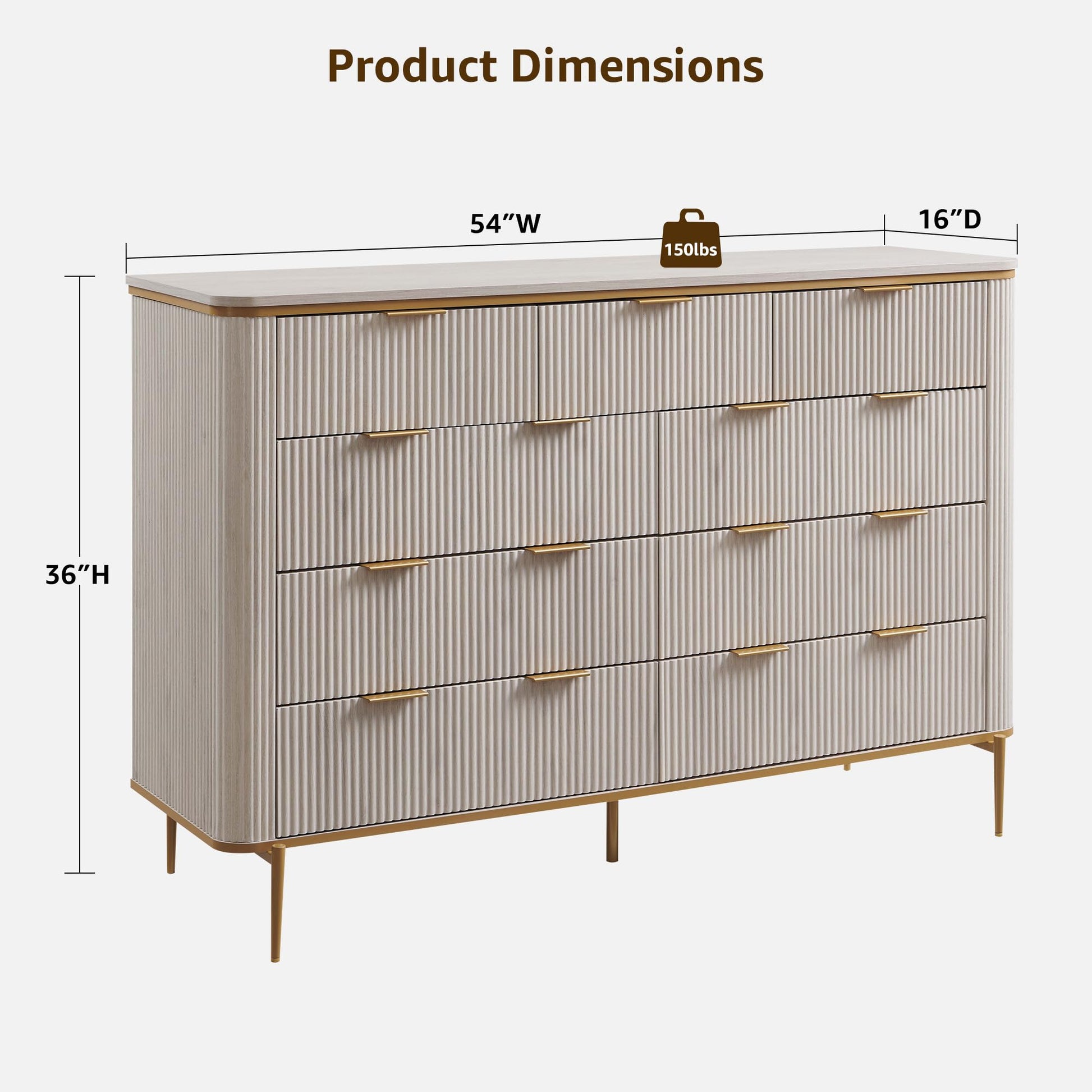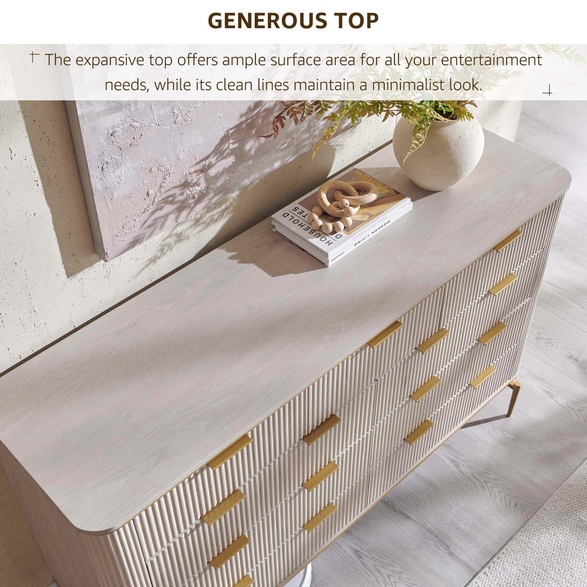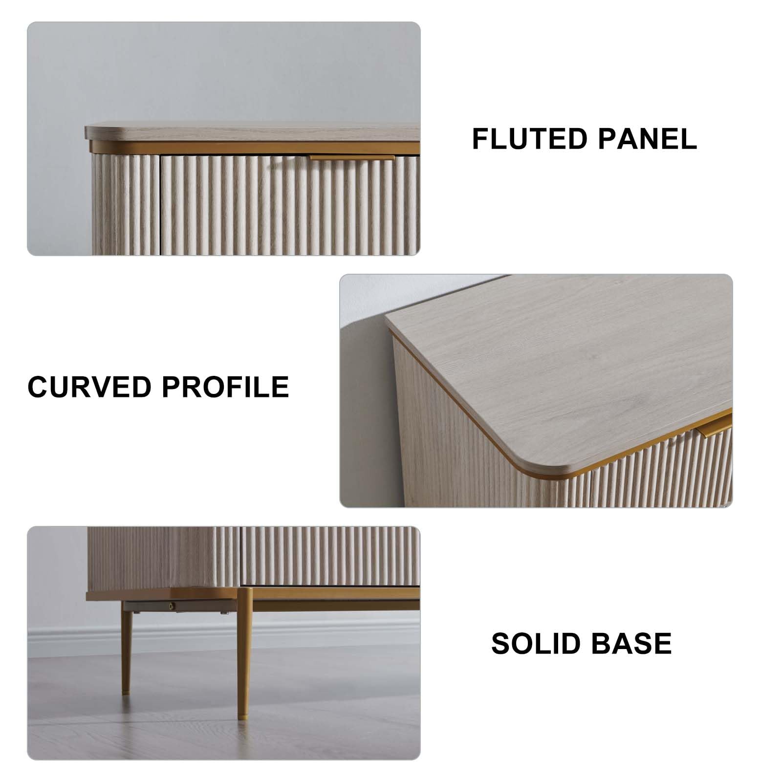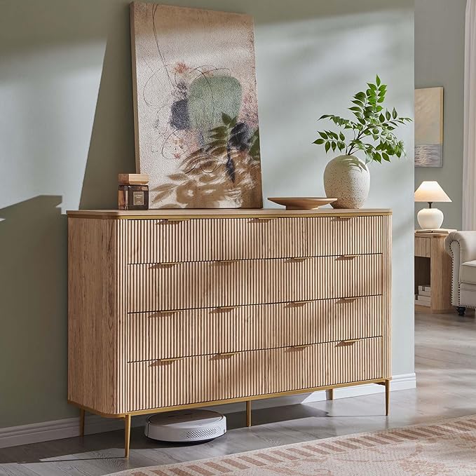 This modern fluted dresser combines elegant design with practical storage solutions. Featuring a curved profile design with gold accents, this versatile piece serves as both a dresser and TV stand, perfect for bedroom, living room, or hallway use.