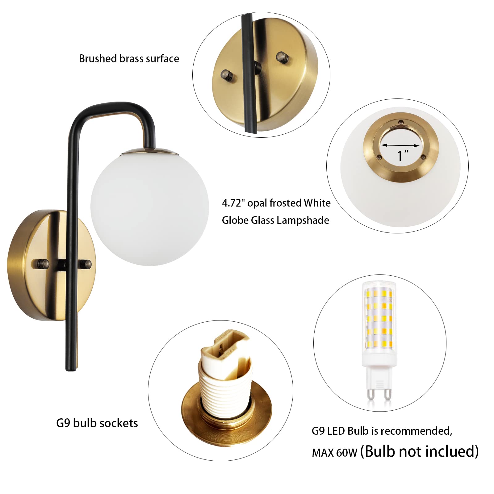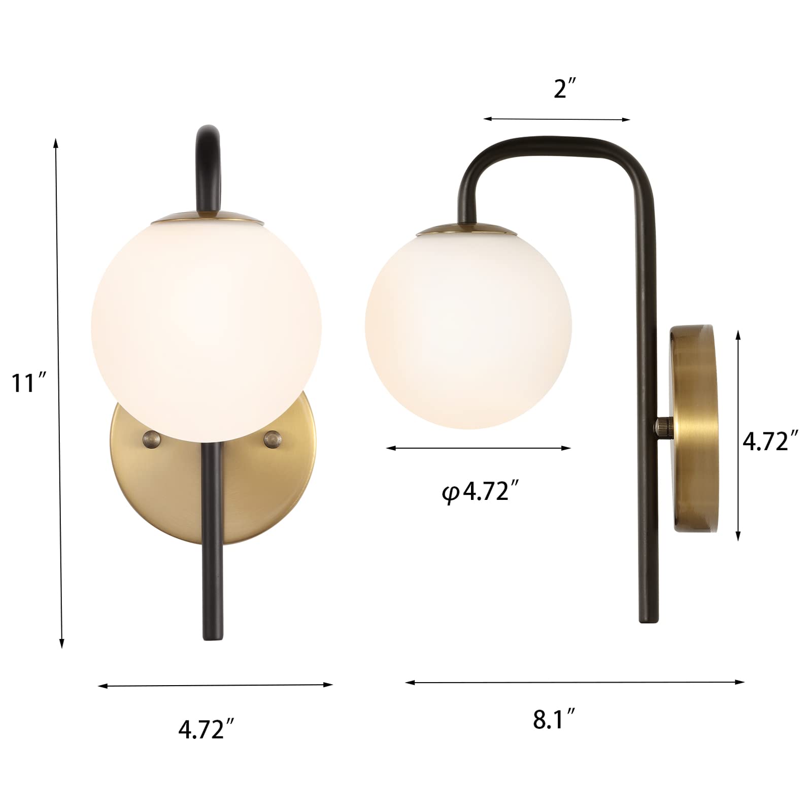 Elevate your interior lighting with this stunning 2-pack modern ball wall light set. Crafted from sturdy metal with a matte black and brushed brass finish, these wall sconces feature elegant white globe glass lampshades that blend contemporary and retro styling perfectly. The durable construction ensures no oxidation or color fading, making them ideal for mid-century modern décor.