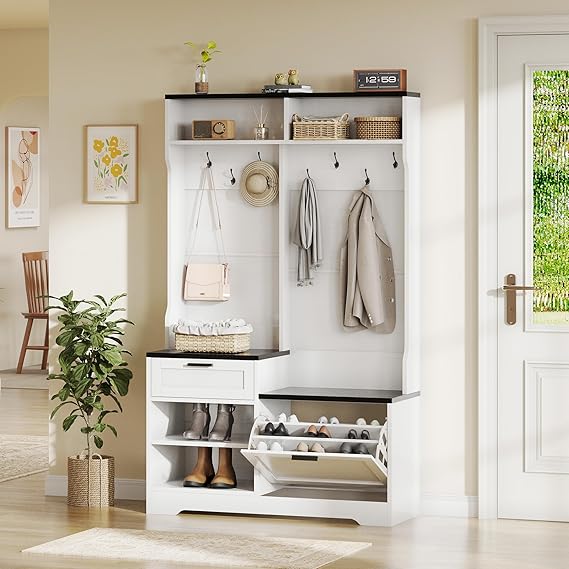 Transform your entryway with this versatile hall tree that combines style and functionality. Featuring a built-in bench with open shoe storage, this piece provides a comfortable spot to put on shoes while keeping your footwear organized and accessible.