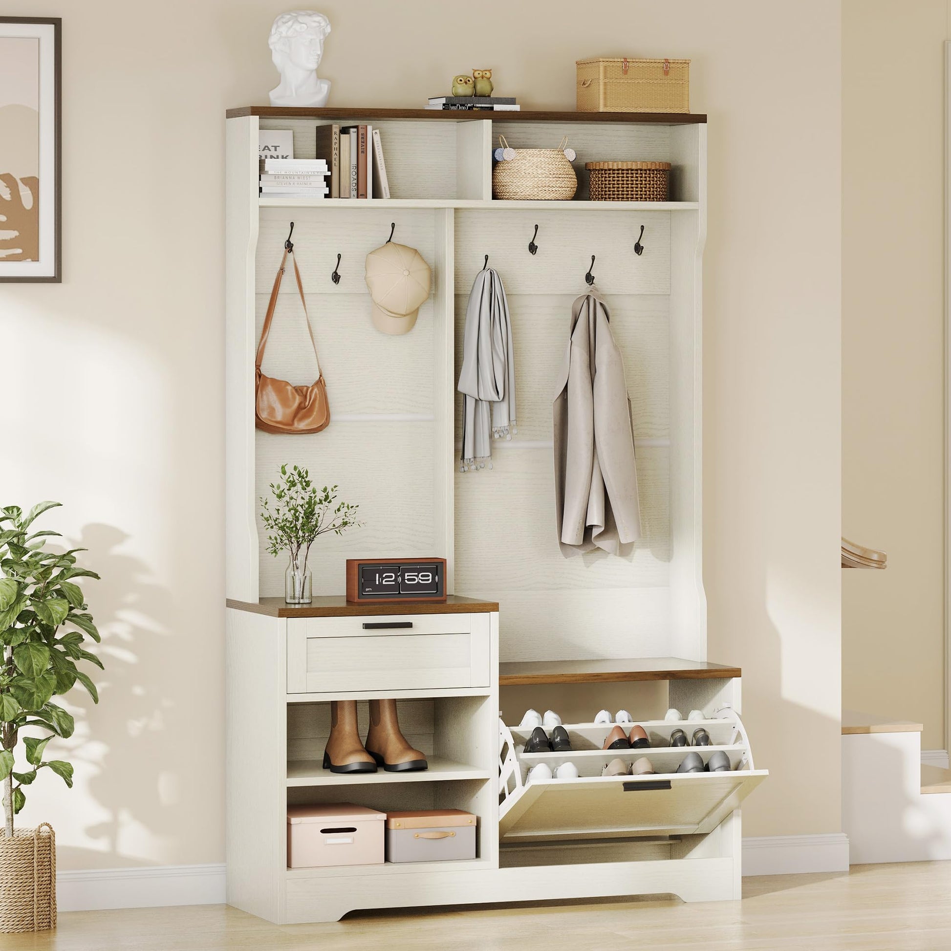 Transform your entryway with this versatile hall tree featuring integrated bench seating, concealed shoe storage, and 7 heavy-duty hooks. Perfect for organizing coats, bags, hats, and footwear in one elegant piece.